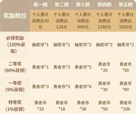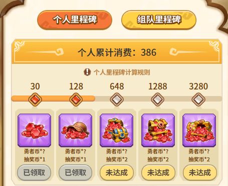其中【个人里程碑】为消费返利活动,在活动期间累积消费额达到规定数额即可获得勇者币和抽奖币的奖励。