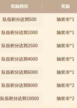 小助手温馨提示:只要队伍组满,平均每人只需要获得2000积分即可领取到最高档奖励,即9枚抽奖币!