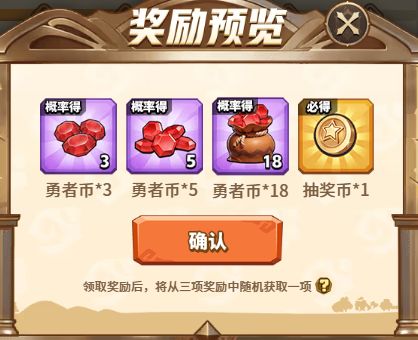 进度奖励分为两种,分别是【抽奖币】和【勇者币】。其中抽奖币数额固定,勇者币数额随机。