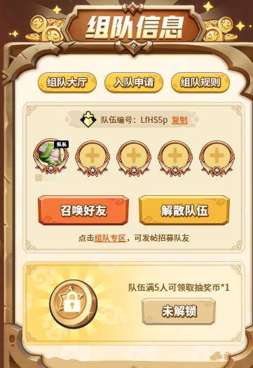除此之外,成功创建或加入队伍,队伍满5人时,小队成员都可以额外获得1枚抽奖币!