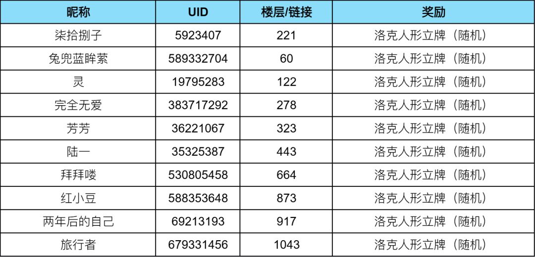感谢小洛克们的积极参与,本次活动已经结束啦,后续我们还准备了其他活动,小洛克们可以积极参与,下面就一起来看看哪些小洛克获得了活动奖励吧~