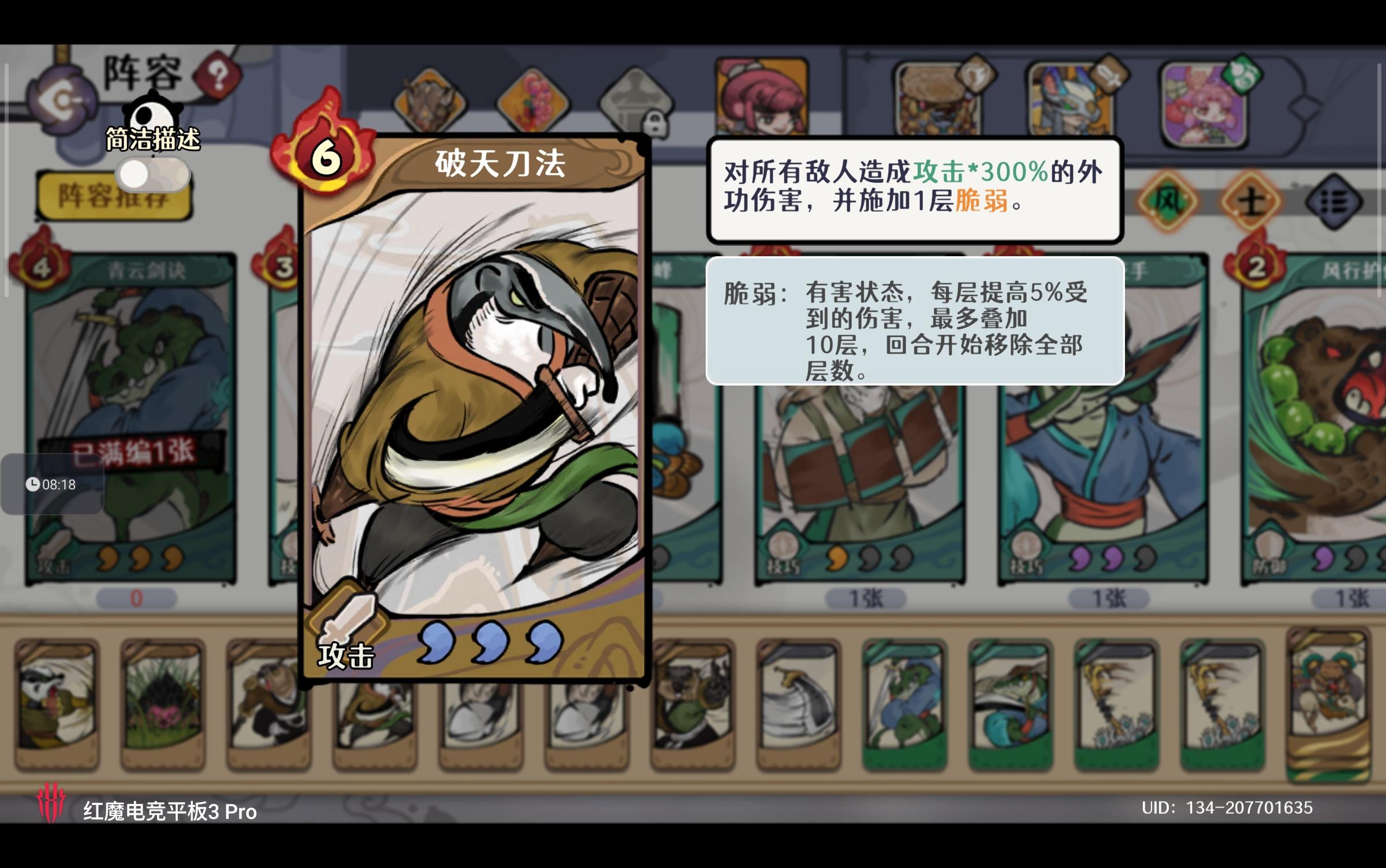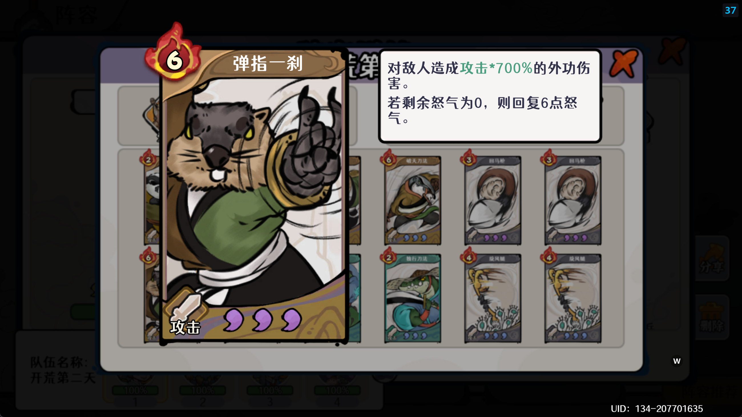 开荒第二天整个的核心围绕着 几张关键武学的获取及升级,在自动剑魔这套体系中 输出伤害倍率的一张卡名为:【弹指一刹】升满级的伤害高达700%! 尽早获取这张卡对于我们输出端的提升是非常大的。