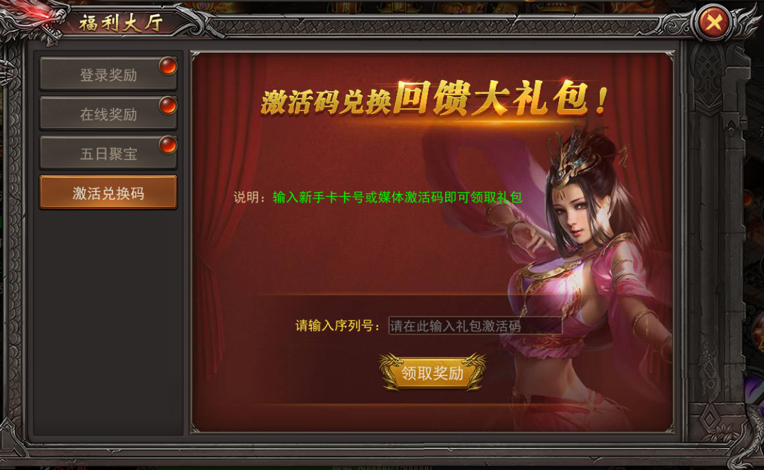 福利大厅-激活兑换-输入兑换码-领取奖励-邮件查收