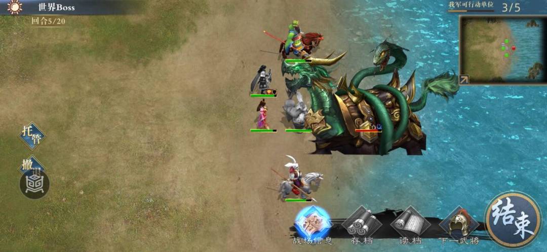 如上图站位:第一回合,徐晃往上走不攻击,张飞走到青龙左边放技能“突刺”,于禁追击,徐晃追击;赵云到青龙下方平A(正面攻击青龙不反击),于禁追击;于禁上前给徐晃吃蓝;貂蝉走到青龙左自下角群加血。第二回合,张飞再往上走两步攻击,于禁追击,徐晃追击;赵云跑到带貂蝉上面攻击,于禁追击;徐晃吃蓝药;貂蝉加血;于禁看情况给貂蝉吃药(戴套貂蝉奶量不足,需要手动喂药),或者大招。操作原则:张飞站桩攻击,三回合用一次技能“突刺”,赵云在貂蝉的上方和右方跑动攻击,触发转身提升伤害,并且处于正面攻击青龙无反。于禁只靠追击打伤害,主动回合看情况喂药;徐晃靠追击枪给青龙禁疗,主动回合吃蓝药;貂蝉看情况加血。按小编这个配置打法,青龙9能打65万左右。
