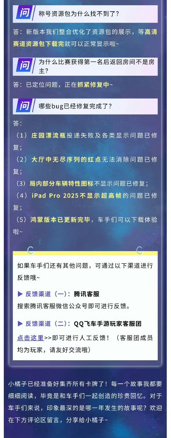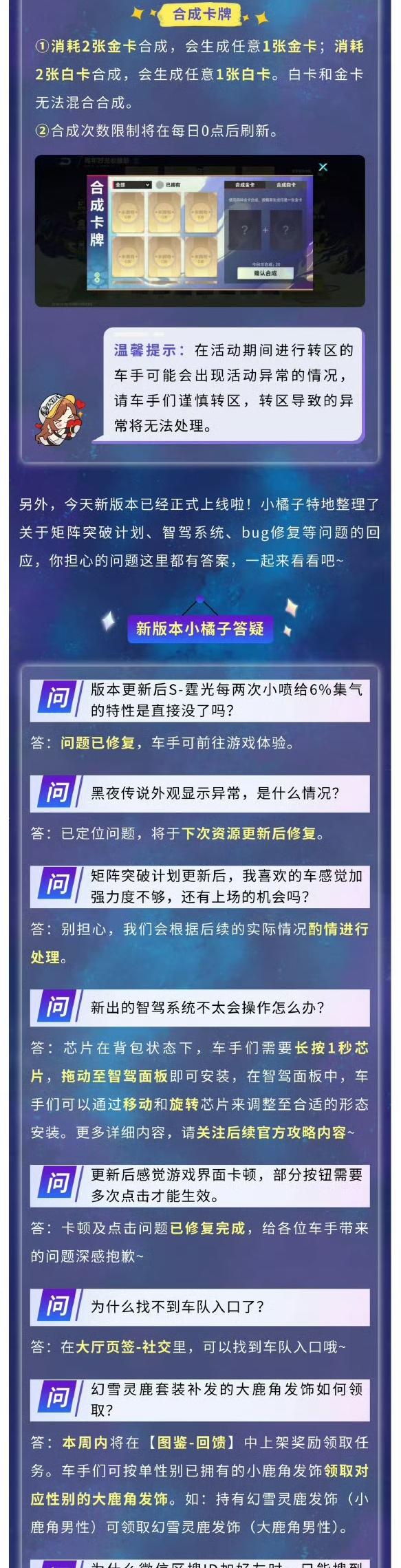 知道你很急但你先别急!八周年主题活动集卡攻略现在就奉上~还有车手们新版本更新后遇到的的问题,小橘子也已经一一解答啦!点击图片查收吧~
