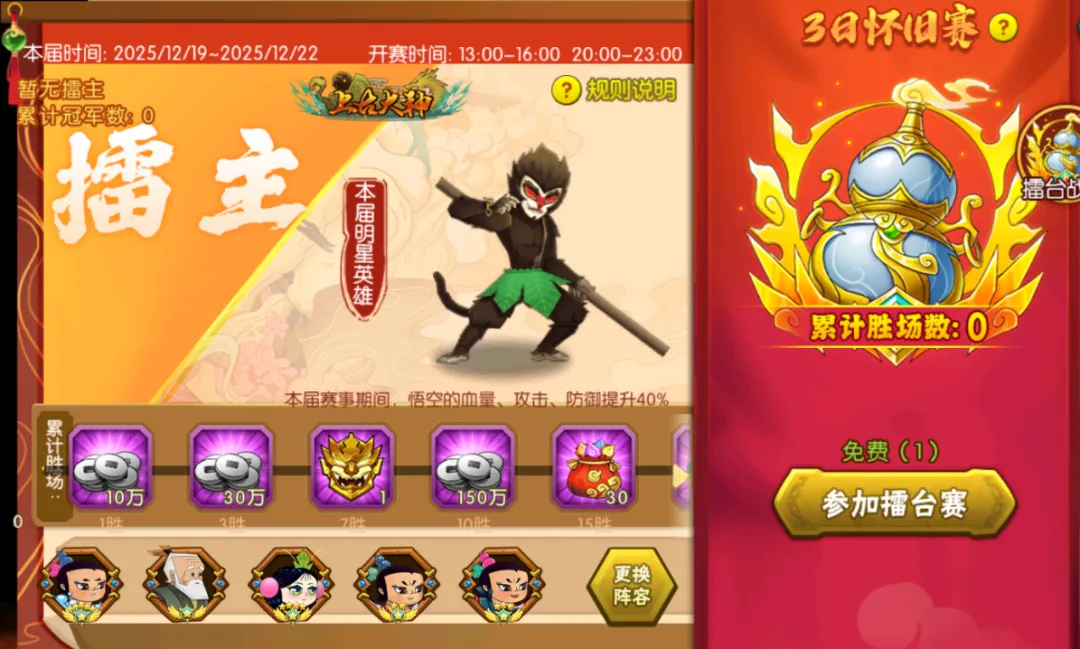 1) 怀旧赛——所有英雄没有巅峰装备,没有带血条神兽。第一名可获得动态称号“上古大神”。