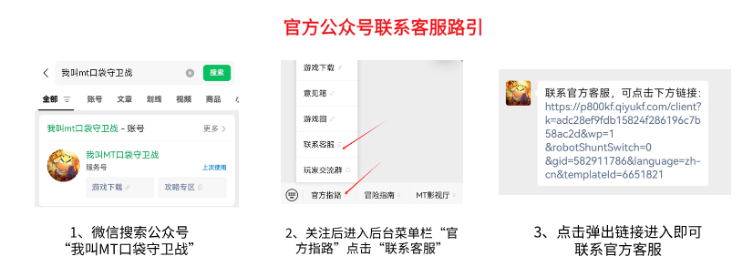 2、IOS用户,可在游戏登录页寻找对应客服入口,亦或前往官方微信公众号后台菜单【官方指南】点击【联系客服】进行问题反馈