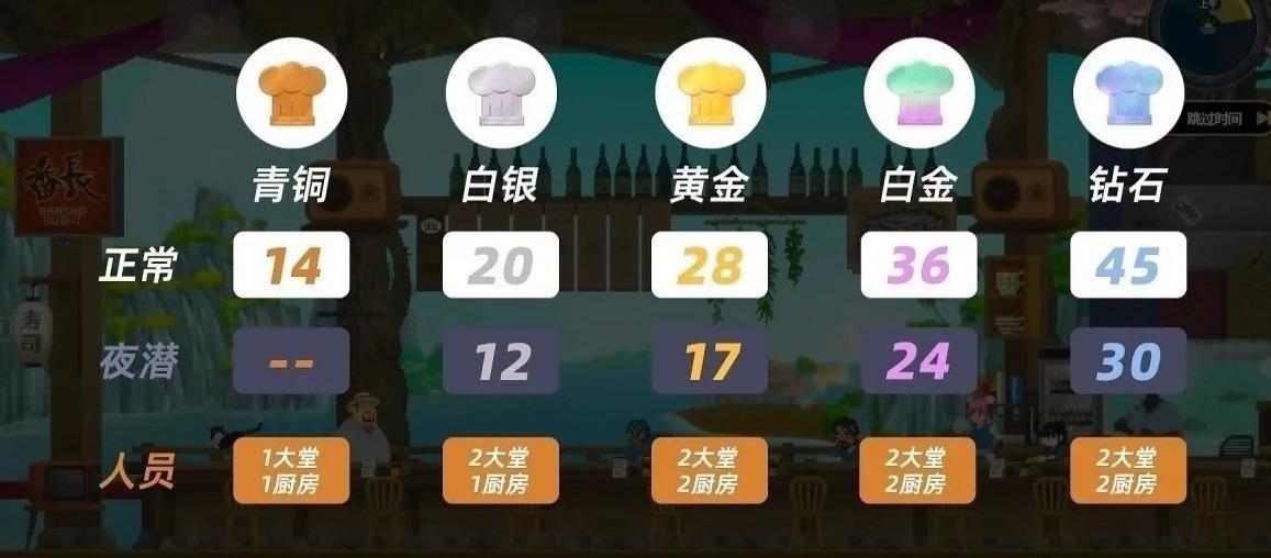 前期尽早升级员工“杏子”到5级解锁“日式河豚冻”,中期一直到后期使用“黄瓜串”和“特级华美寿司”