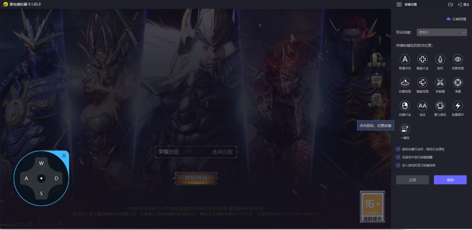 实用技巧:雷电模拟器键鼠自定义设置为了让操作更适配《荣耀出征》的战斗玩法(如剑士的冲锋控制链、魔法师的范围输出),可借助雷电模拟器的键鼠设置功能优化操作:启动《荣耀出征》后,点击模拟器右侧工具栏中的“按键”图标(键盘形状),进入按键设置界面;也可直接按F12查看官方预设的按键方案。基础设置:将“方向键”拖动至屏幕左侧,默认WASD控制移动,可根据习惯修改;将“普通点击”绑定至鼠标左键,用于基础攻击。技能键设置:将“普通点击”或“连击”功能拖动至游戏技能按钮位置,绑定键盘上的Q、E、R等按键,实现技能快速释放;对于需要连续释放的技能,可设置“连击”功能(默认5次/秒,可调整频率)。视角控制:拖动“右键视角”至屏幕右侧,设置后长按鼠标右键即可自由转动视角,适配游戏中的3D战斗场景,方便观察战场环境与敌人位置。设置完成后点击“保存”,取消勾选“在游戏中显示按键提醒”可隐藏界面按键标识,获得更纯净的视觉体验。