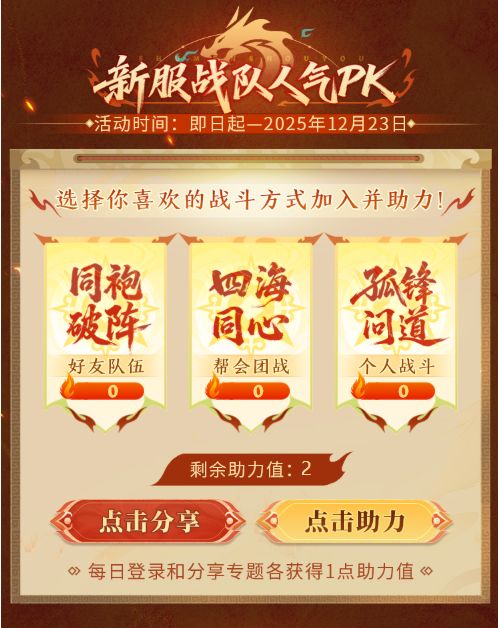 即日起至12月23日点击激战服专题登录并选择你想加入的队伍,每日为其投送火力值,将有好礼领取!每日登录和分享会各获得1次助力值,点击助力即可为你的战队积攒火力值;