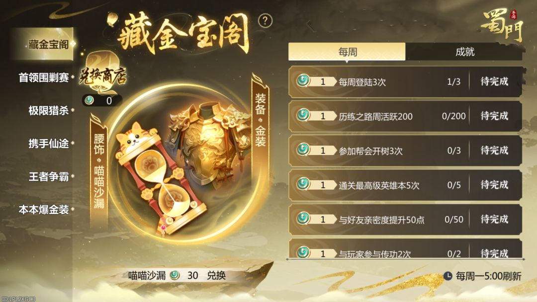 激战服活动藏金宝阁内,完成指定任务获得货币,可兑换金装自选和永久腰饰喵喵沙漏!入驻新服就获得高级装备,还有可爱腰饰佩戴身侧,逍遥走江湖意气风发~