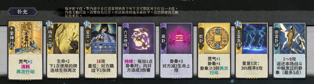 初始仙命,每突破一次扣一生命上限,抽一张该境界的牌,因为白板后招已经不可能有像样补强,并且内伤只在过度时有用,而且七星阁卡组的联动性基本没有,而且该仙命并无定向检索,所以强度较低,而因为能玩的卡组并没有恢复,扣四点生命上限实际有点伤,纯粹的负战力仙命。