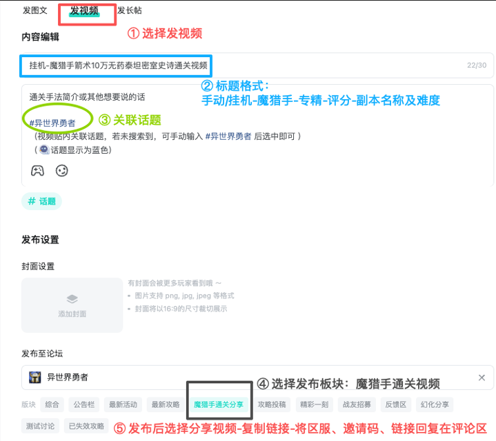 3、视频标题格式为【挂机/手动-魔猎手-专精-评分:XXX-关卡名称和难度通关视频】,
