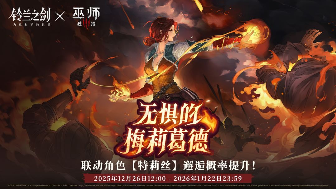 「无惧的梅莉葛德」邂逅将于 2025/12/26 12:00 - 2026/01/22 23:59 开启,联动传说角色「特莉丝」邂逅获取概率将大幅提升!