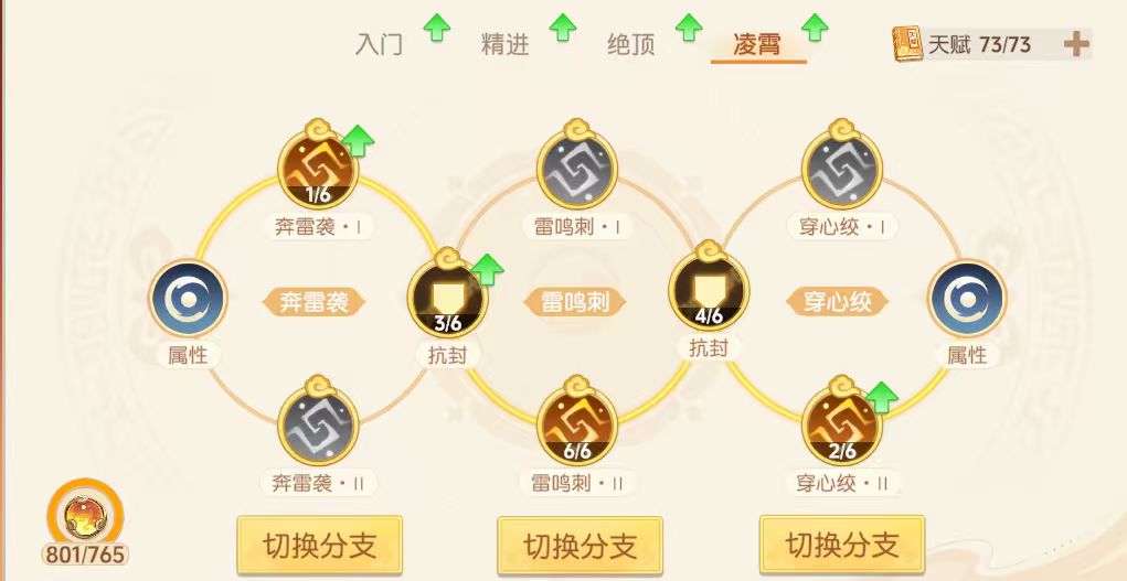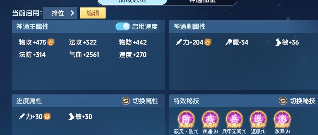 神通方面因现版本心法对85%以上神通加成太多,加上九霄对面板需求高,建议除6阶保留3澎湃、4阶保留1兵甲外,1-5阶优先选择85%以上神通。在此基础上最好能有3疾速。