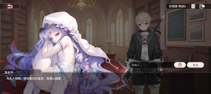 圣女辛,换各种话语和表情包尝试,感觉表情包比话语好用,正向的表情包一般都加好感度,这个拥抱爱心的表情包,好感度+3,有几种回复,我比较喜欢相拥这个