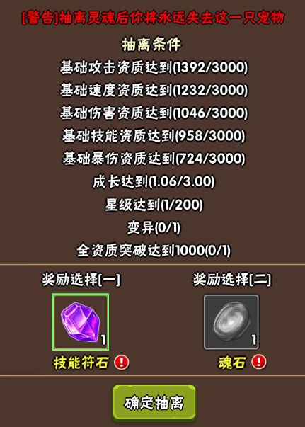 天赋是红色的那个宠物自带的,是无法跟技能一样进行合成的,你需要满足以下条件进行技能石抽离,技能石和魂石条件不一样,别看错了。