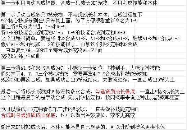 具体解释一下便是将宠物以1~9编号,先将1~5的技能合成到一块,然后6~9合成到一块,然后将这两个宠物合成,这个时候如果没有丢失9核的技能就算成功,如果掉了就要重新合成,比如2589四个技能都掉了,那就再合一个有这四个技能的宠物拿来再合一次,直到9个技能都有。个人建议这样的9核宠物自己手搓4到6个放在仓库里面(神器经验记得重置给琼浆玉露)(这个过程你后台可以自动转生挂着普通或者中等刷牌子,别耽误了)然后依次拿这个宠物跟自动合成出来的3成长合成,这个时候需要点击保存资质,别让3成长的资质掉了。个人建议每次3成长不论掉了什么技能都去跟完整的9核合成(个人玄学,我感觉两个宠物都有的技能不容易掉,没有任何理论支撑纯玄学)。如此整个过程你都不用关心本体是啥宠物,因为这个宠物必须要进阶到金色等阶的,到了金色是可以任意更换本体的。记得也要升满资质和星级哦~![[表情_送花]](https://img.tapimg.com/market/images/68b3dc8473df915ad2b85da5efef4f56.png)