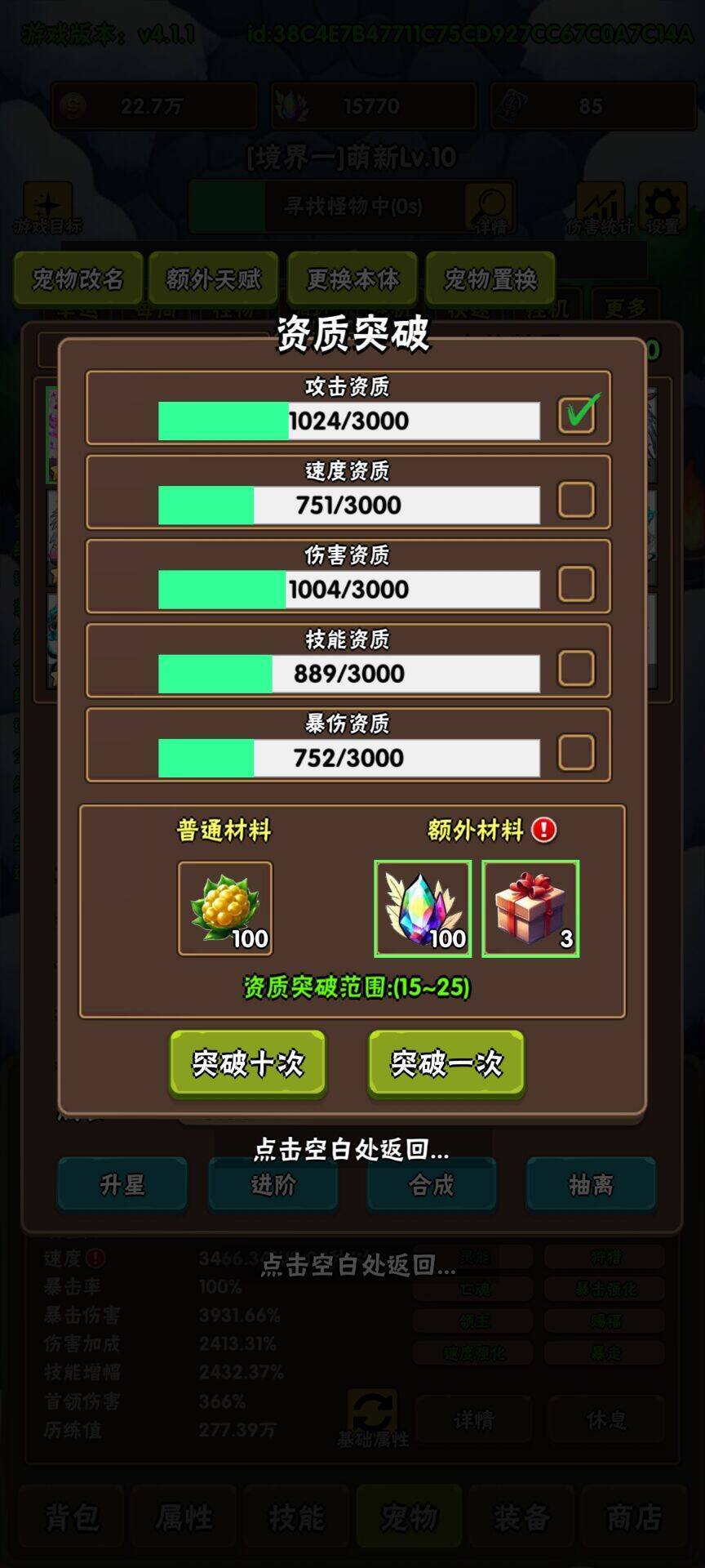 双天赋的进度都是卡在资质突破上面,突破所需果实在宠物试炼里面可以获取,5k亿伤害结算一把获取110/55个突破果子,总有两种果子数量只有一半,目前原因不知(不重要)。而突破消耗中每增加100突破资质消耗果子加十。每次消耗果子会在0~25之间进行随机数,而消耗3个额外盒子可以使随机数变为10~25,使用钻石变为5~25,一块使用为15~25。前期果子及其稀缺,个人建议每次突破务必双选以确保果子的最大化利用。