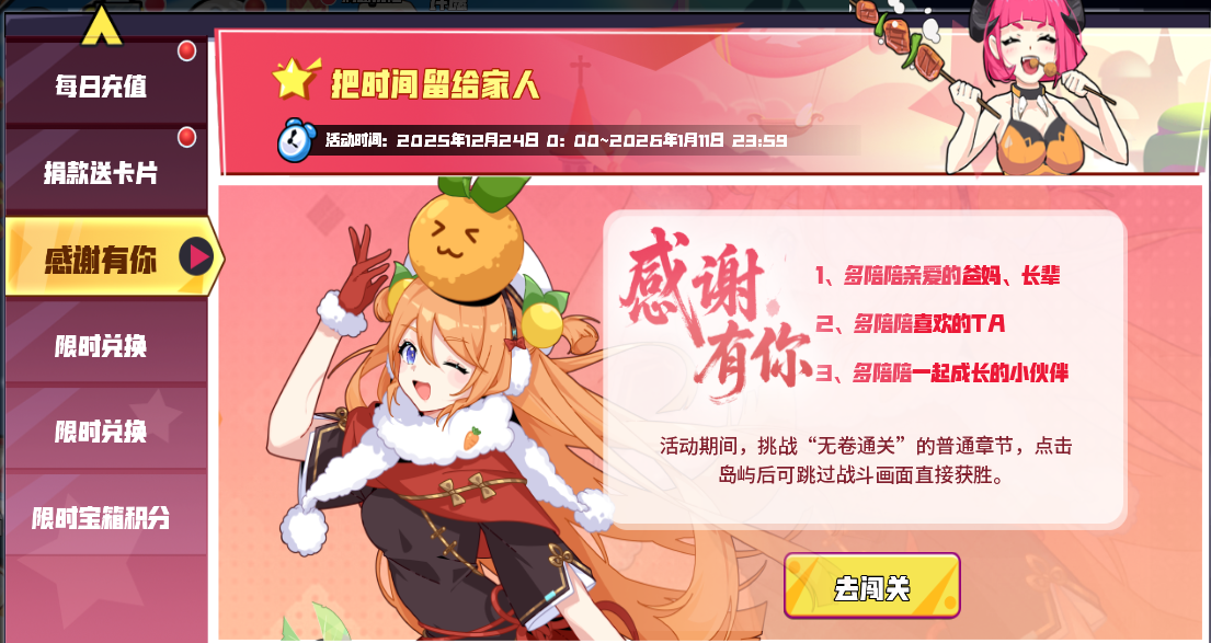 活动期间,在已通关章节内收集随机掉落的圣诞袜,兑换奖励(每日上限20个圣诞袜)