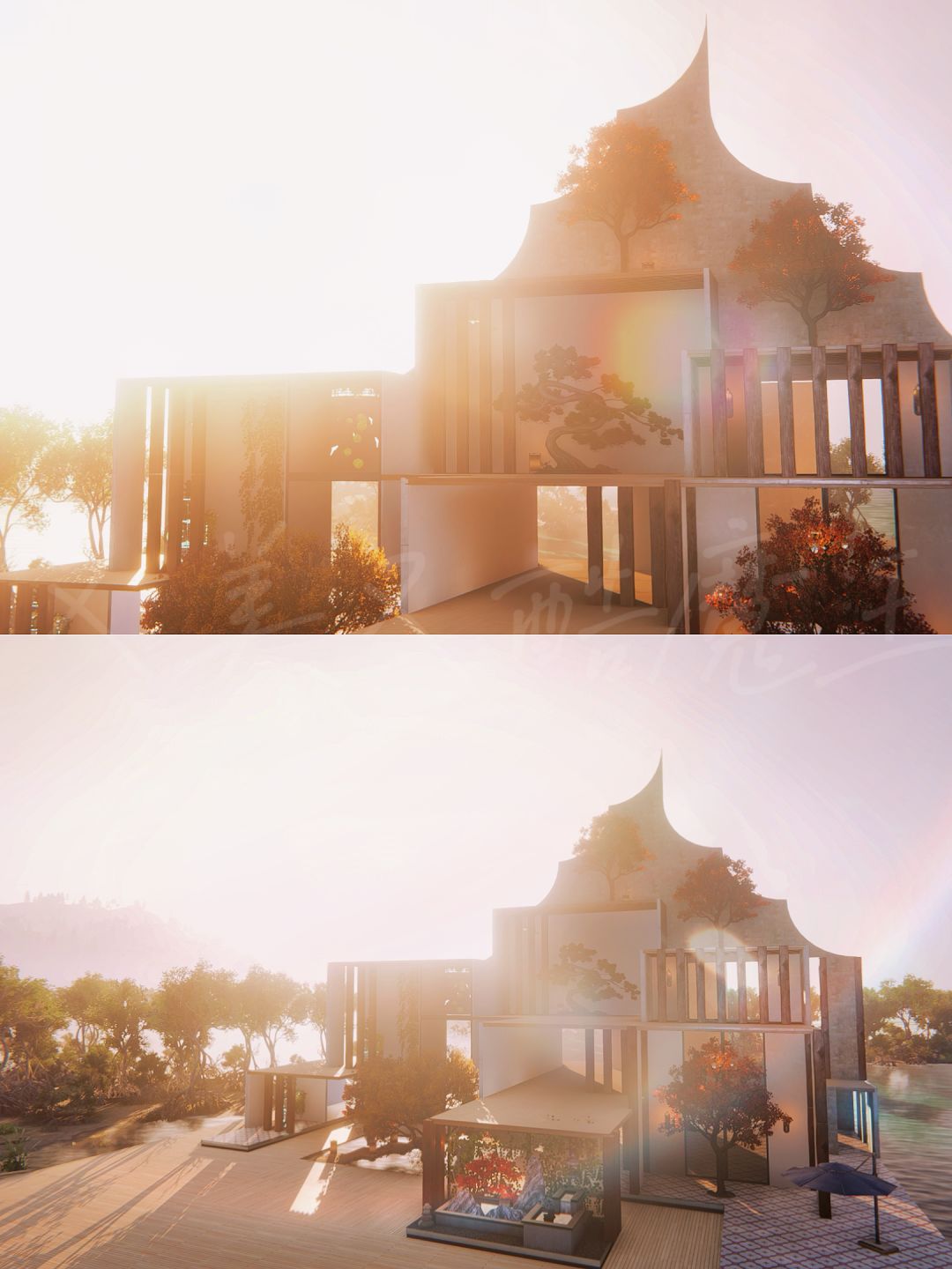 本次魔王带来的作品是新中式🏠现代别墅,融合了传统和现代元素,整体氛围静谧、典雅,结构上使用了大量的木质结构,采光比较通透,环境上有丰富树木、盆景、水域,整体色调偏冷,但室内使用了暖黄灯光,又增加温馨感。