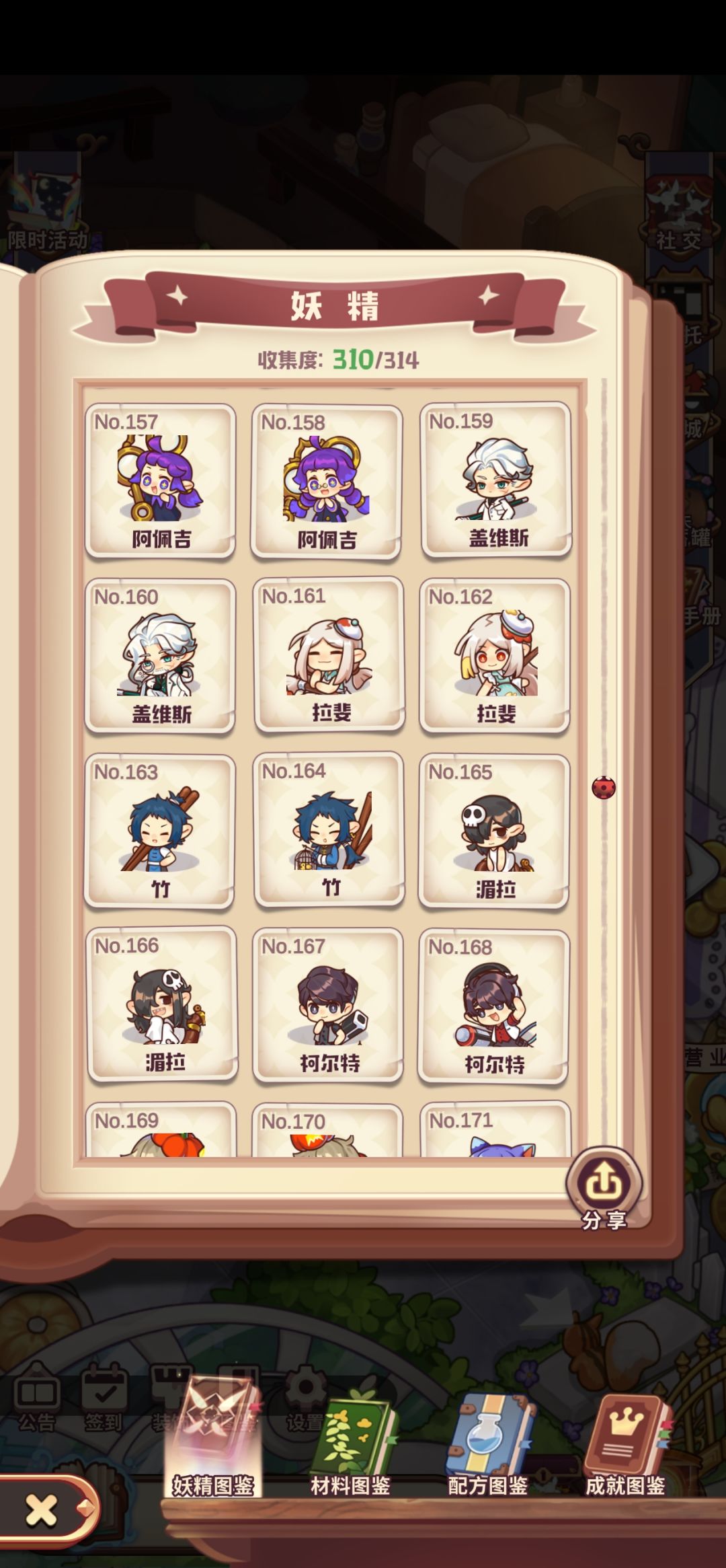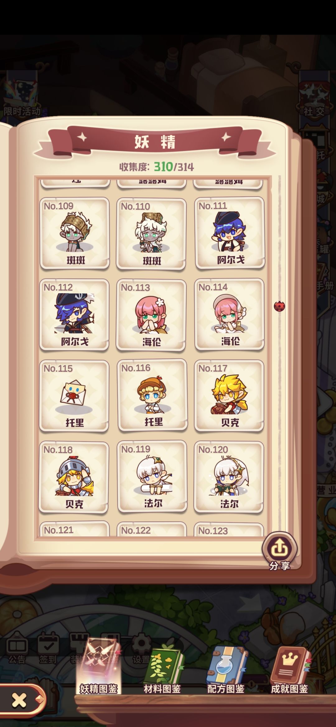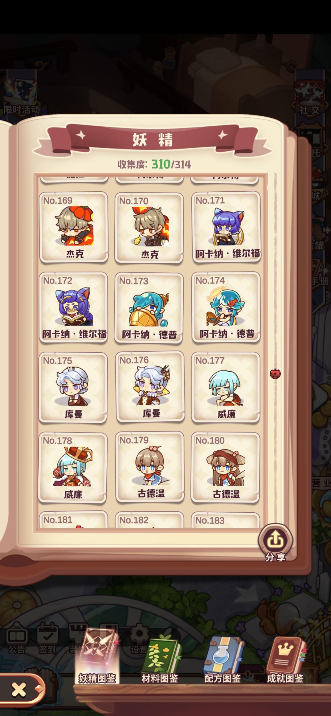 每个妖精进化前进化后各占一格,图鉴总计五星55、四星63、三星24、二星11、一星4。我差五星1、四星1。根据其他玩家提供的消息,推测195和196为四星杰拉德(漂流瓶),可能为后续某一活动获取。375和376为五星瑞贝卡(小猪储钱罐),忘了是春节还是游戏周年庆时推出,氪金获取。