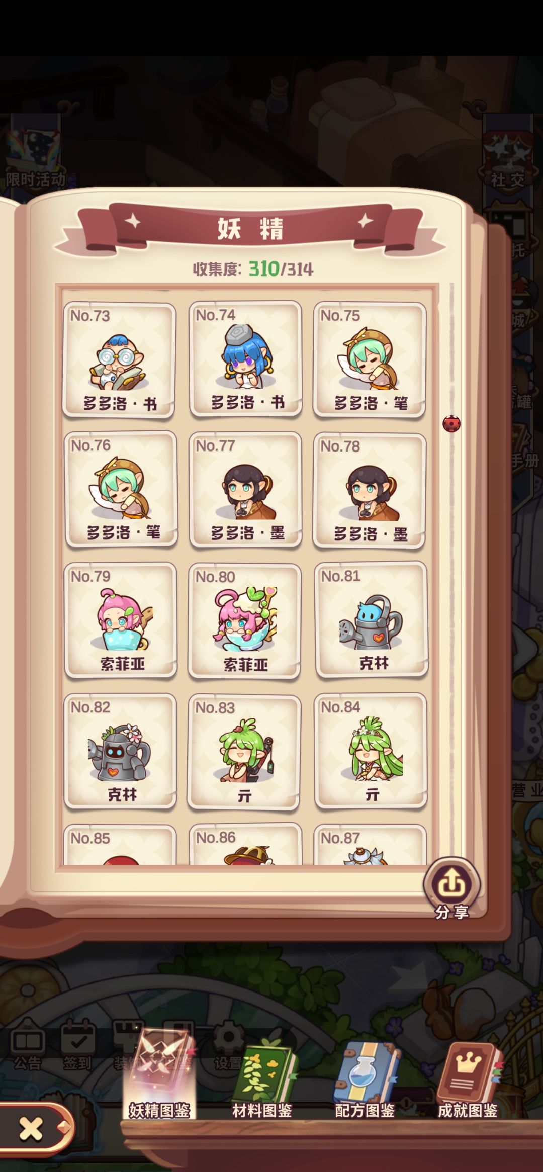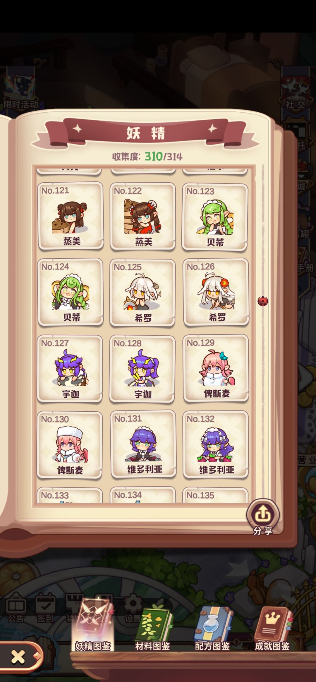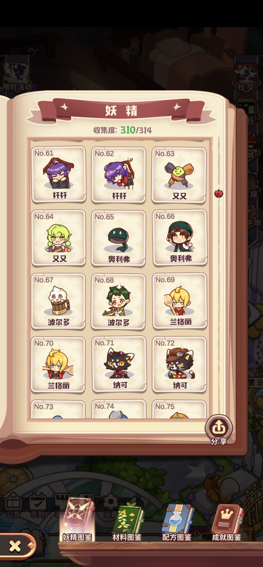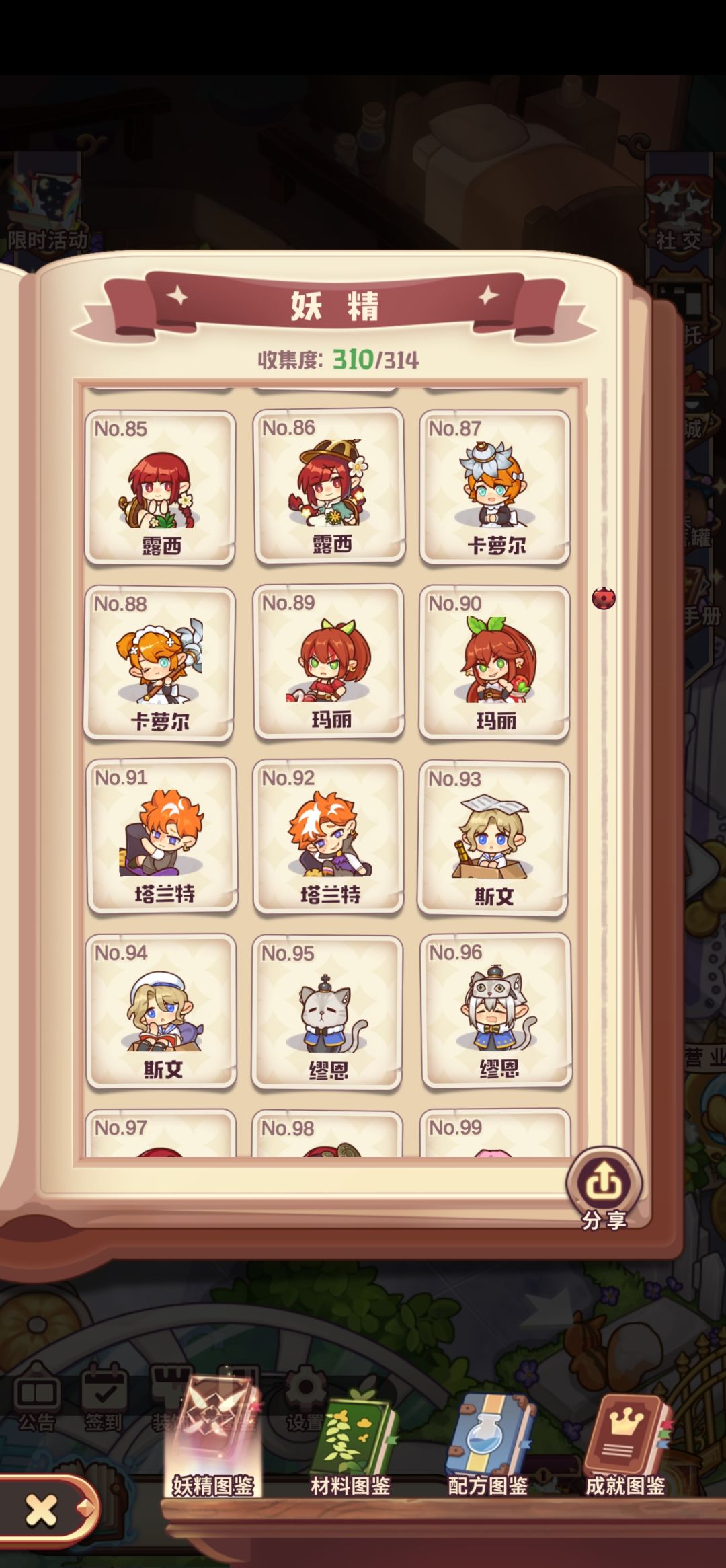 每个妖精进化前进化后各占一格,图鉴总计五星55、四星63、三星24、二星11、一星4。我差五星1、四星1。根据其他玩家提供的消息,推测195和196为四星杰拉德(漂流瓶),可能为后续某一活动获取。375和376为五星瑞贝卡(小猪储钱罐),忘了是春节还是游戏周年庆时推出,氪金获取。