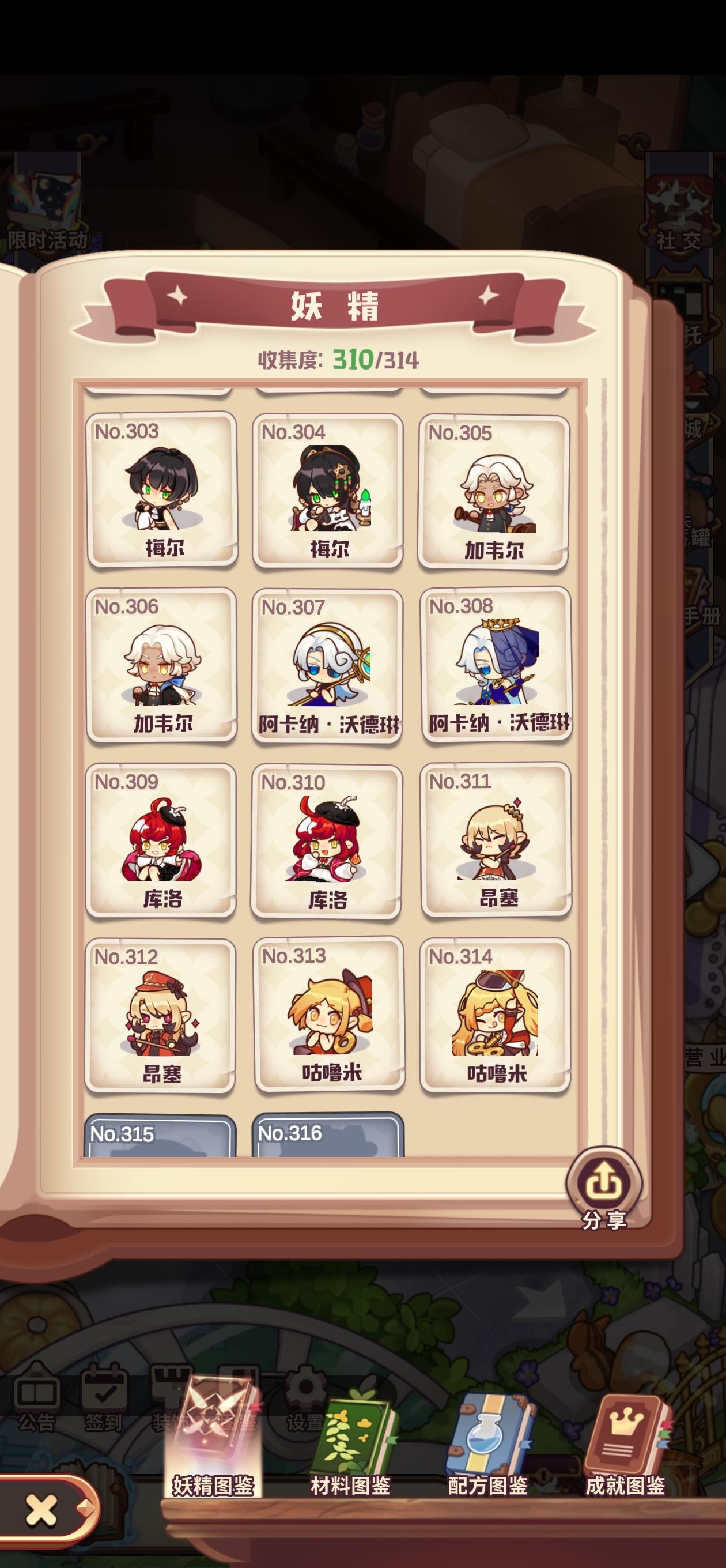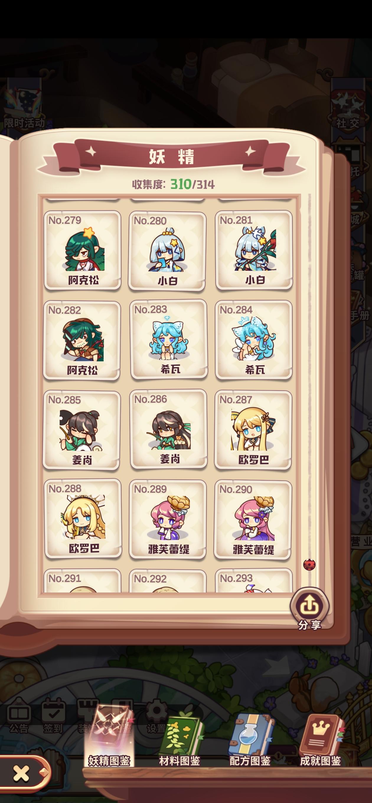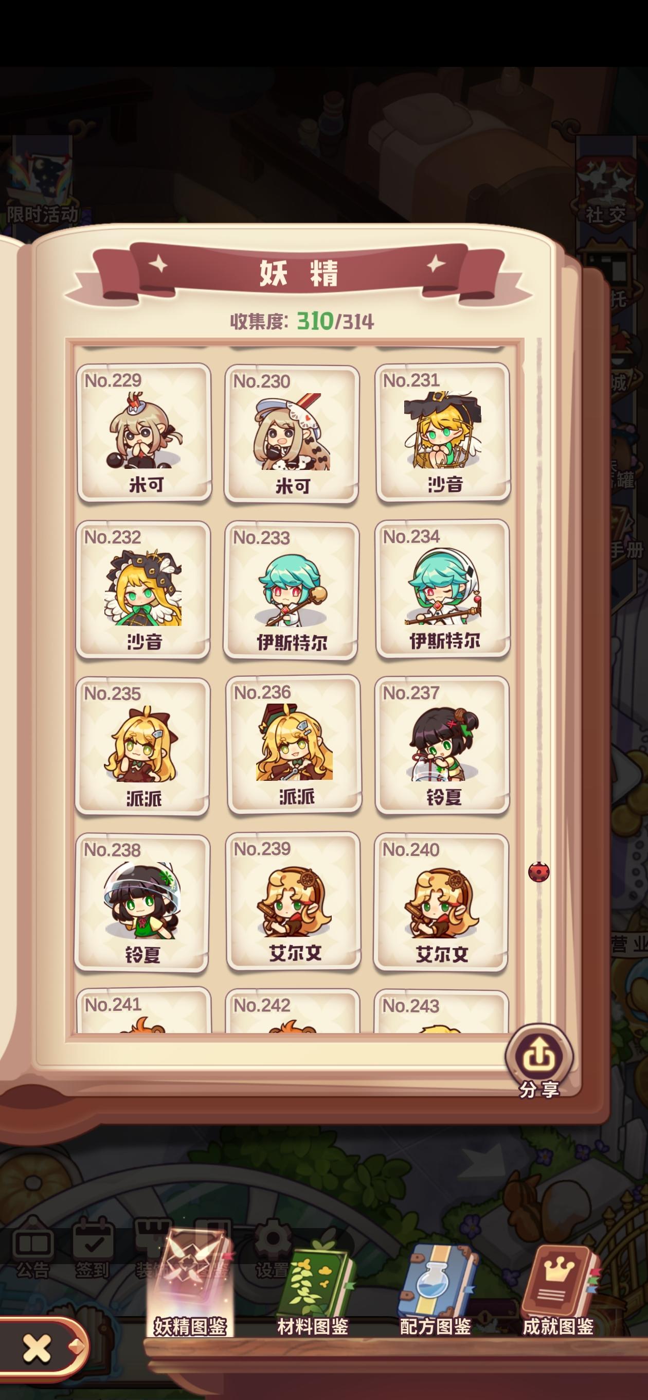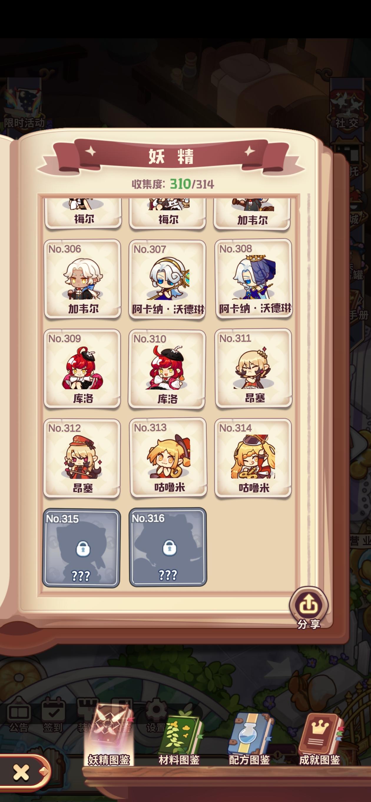 每个妖精进化前进化后各占一格,图鉴总计五星55、四星63、三星24、二星11、一星4。我差五星1、四星1。根据其他玩家提供的消息,推测195和196为四星杰拉德(漂流瓶),可能是后续某一活动获取。375和316为五星瑞贝卡(小猪储钱罐),忘了是春节还是游戏周年庆时推出,氪金获取。