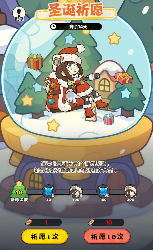 通过完成任务或购买礼包获取圣诞祈愿券来抽取奖励。