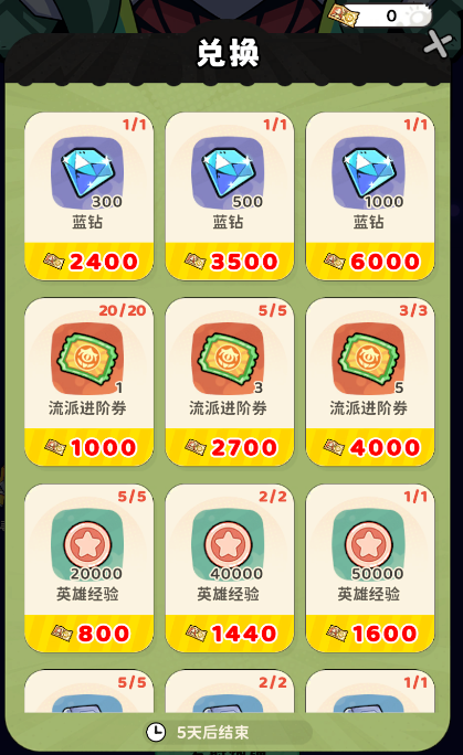6、红钻商城增加蓝钻礼包(2000蓝钻/68红钻),流派进阶券(5张/68红钻),体力礼包由10点增加到12点/红钻。