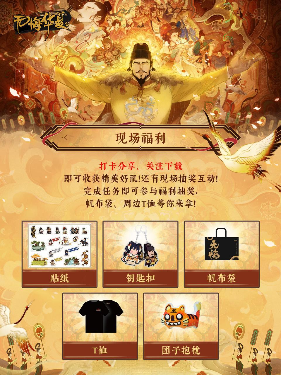 现场按要求下载《无悔华夏》游戏,即可参与惊喜抽奖!(原本就有下载的王上可直接在现场参与哦~)100%必中,绝无空奖~帆布袋、T恤、团子抱枕…等你来拿!