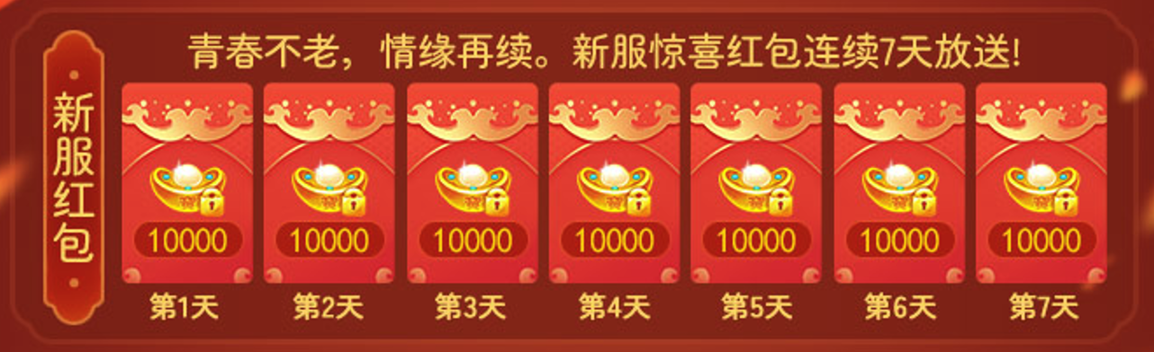 开服前7天,每日20点系统将在新服送出10000元宝助战红包。记得准时上线,抢先一步财富尽在你手!