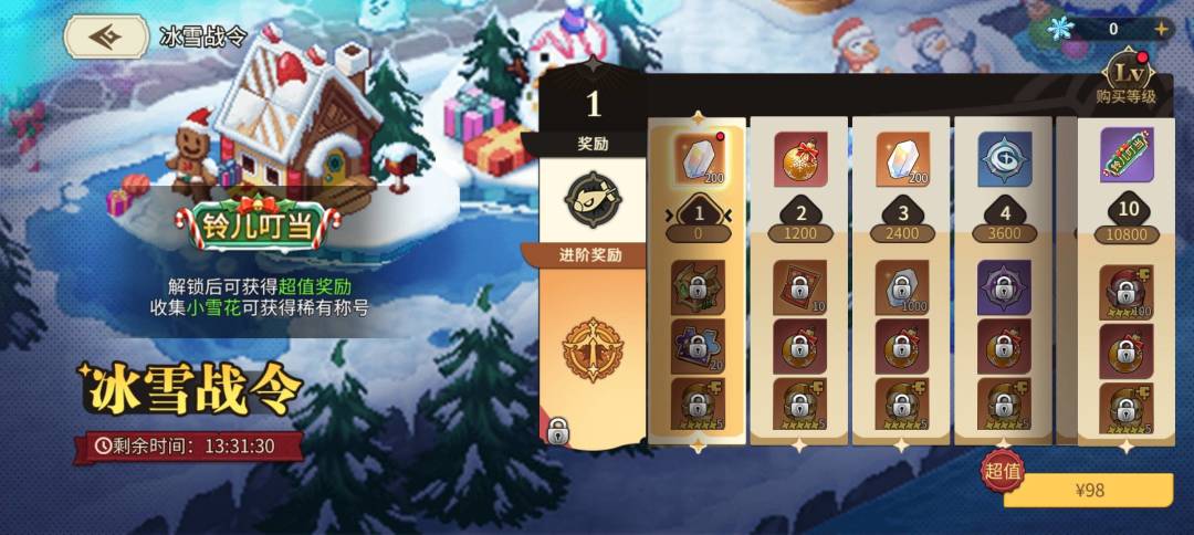 Ⅴ. 冰雪战令 活动期间参与活动可获得“小雪花”,收集“小雪花”提升战令等级还将领取称号“铃儿叮当”(重复获得相同称号将自动转换成曜晶);