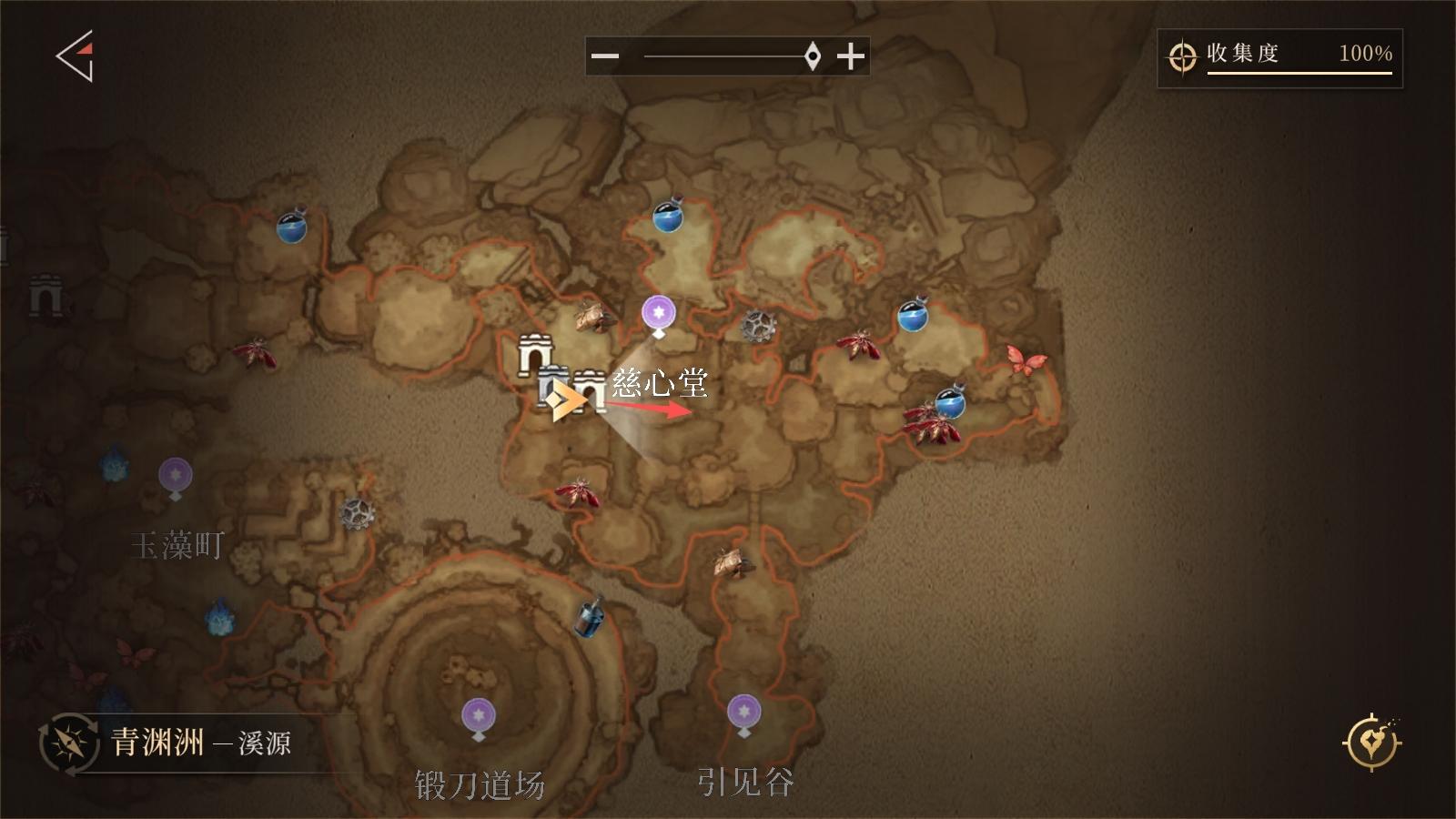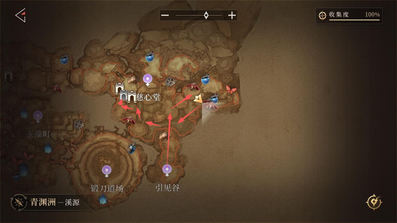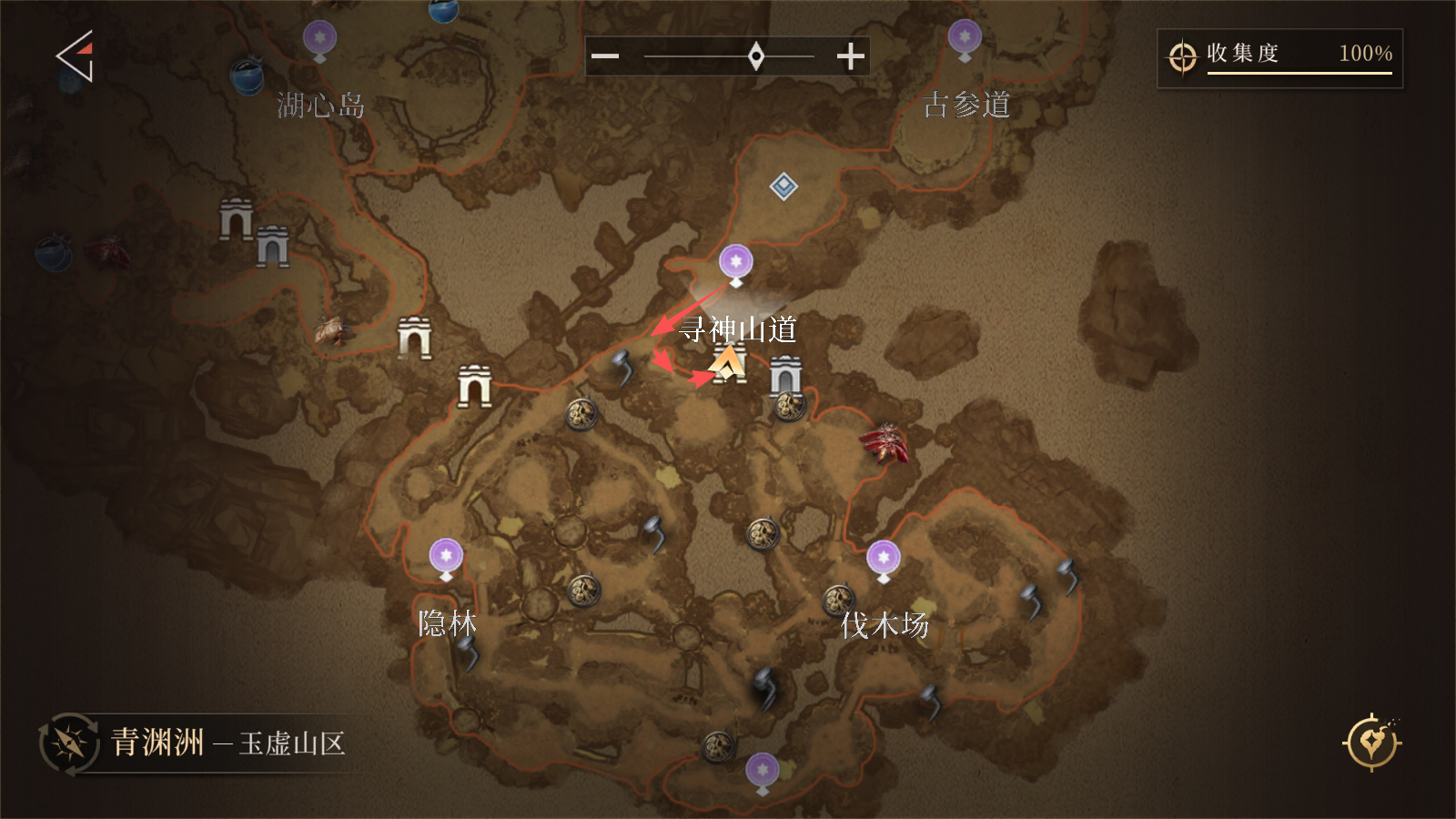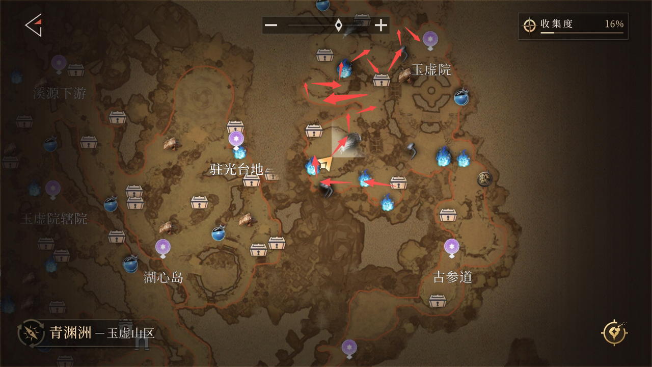 从「玉虚院」传送点出发,反向沿箭头路线行进