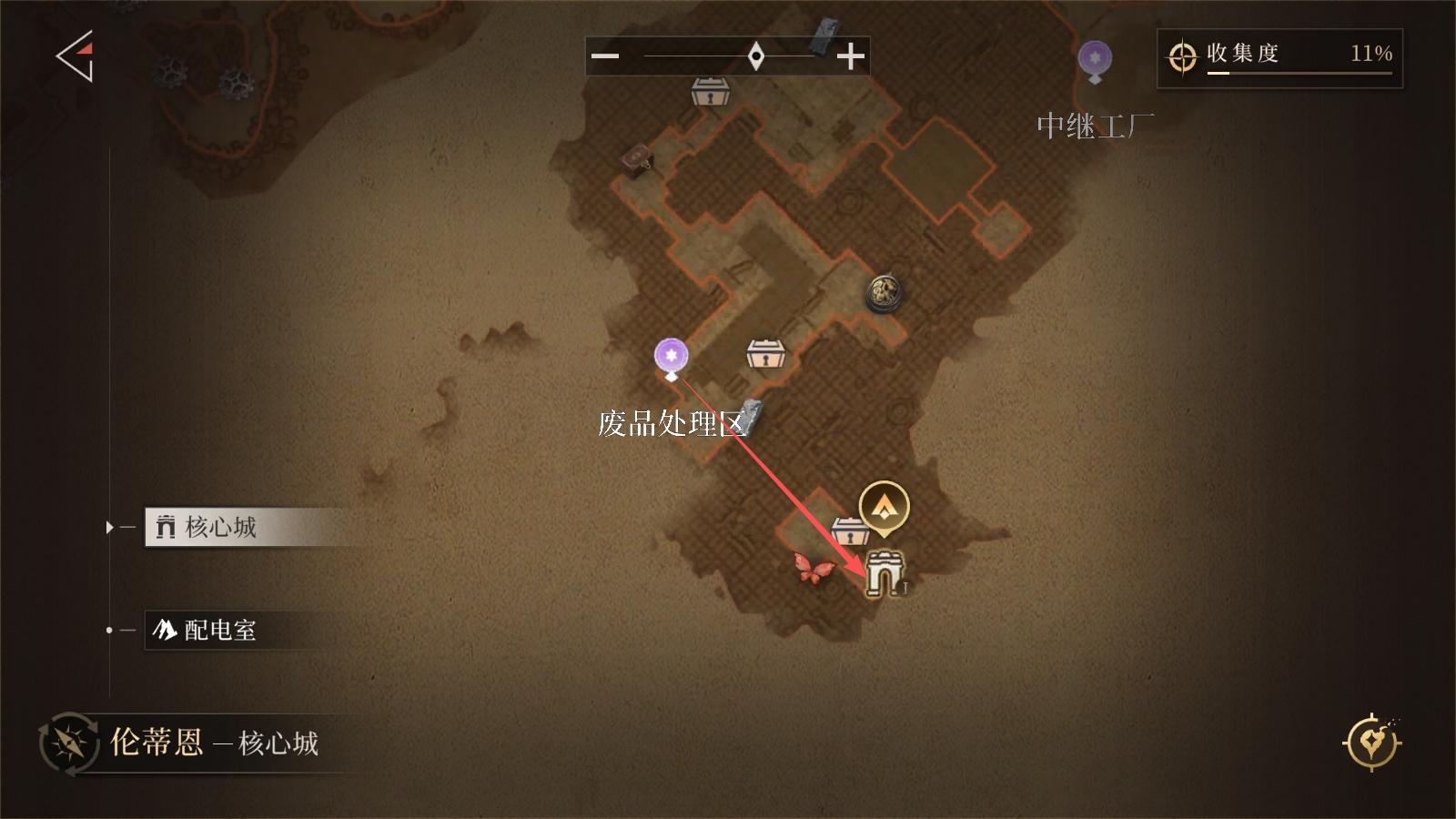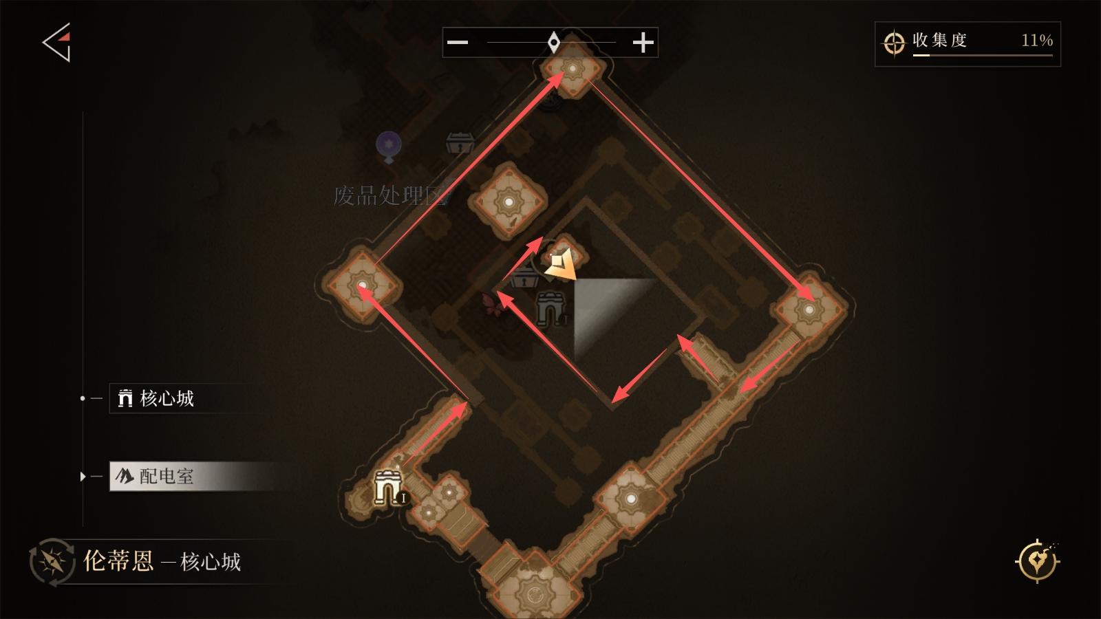从废品处理区出发,按箭头进入配电室(注意!需反复交互机关,耗时较长;洞穴内有雷史莱姆放电攻击,需卡节奏移动机关)