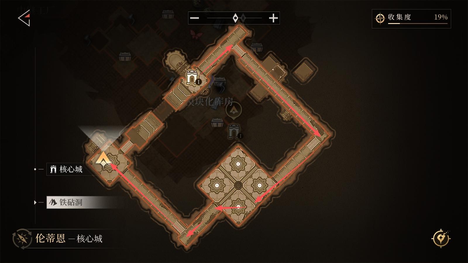 从模块化库房前往铁砧洞,按箭头行走(洞穴内有机关,难度较低,耗时相比上一个宝箱较短)