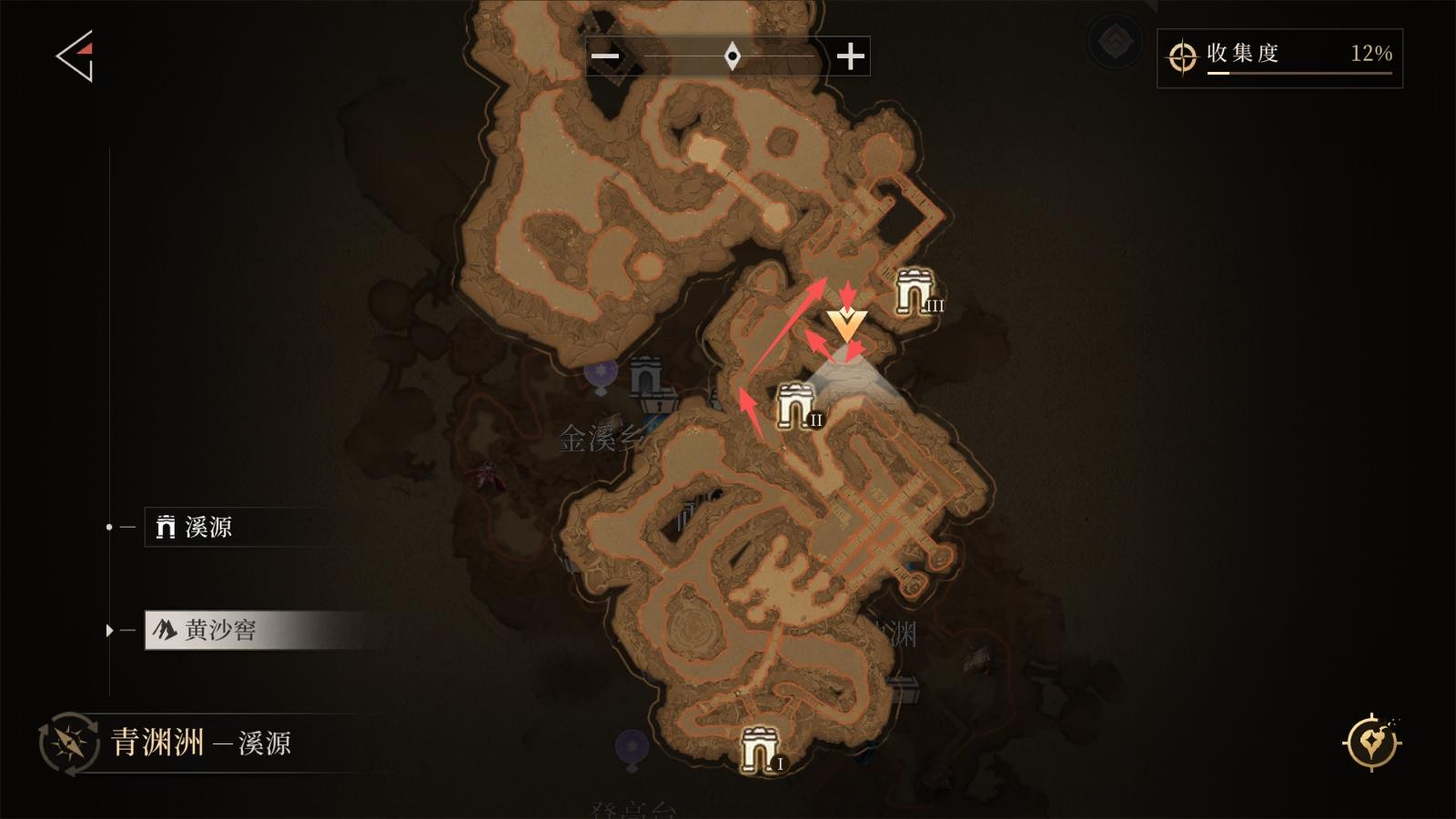 从「金溪乡」传送点出发,按箭头行走(中途需上坡,位置较隐蔽;需击败 1 只 BOSS 后继续前行
