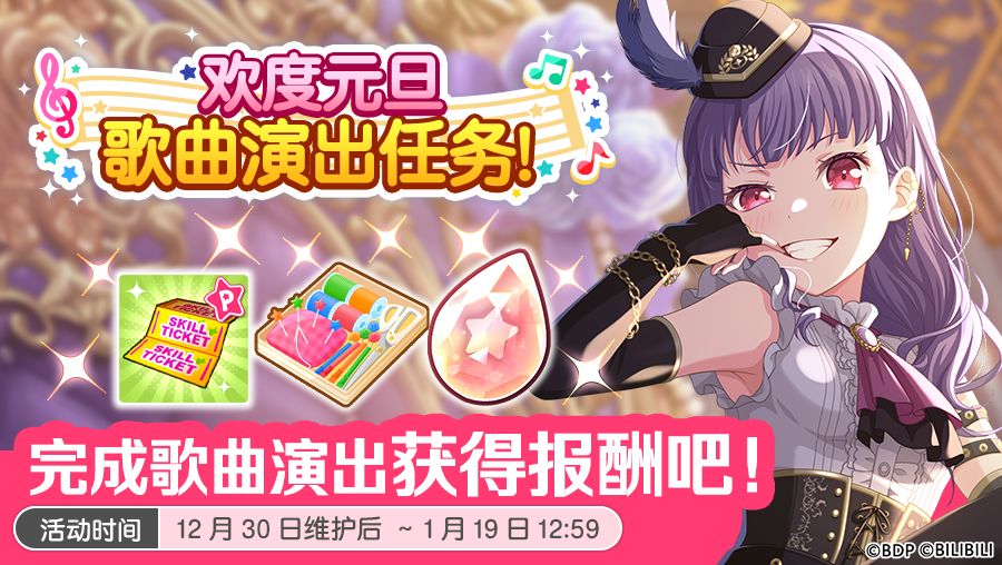 为庆祝2026元旦佳节的到来,12月30日维护后,游戏内将开启「欢度元旦纪念歌曲演出任务」和「金币掉落追加活动」!活动期间内,完成特定的歌曲演出可获得「乐队专用技能练习券」、「裁缝套装」、「奇迹水晶」等丰厚奖励,请不要错过!