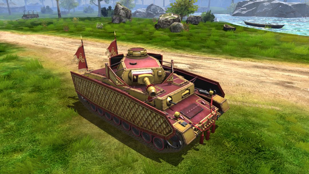 II型和III型改装状态下炮塔侧箱与炮管的朱缨铜扣装饰是涂装灵魂标识:炮管根部的红缨铜环复刻了背嵬军 “锥枪缨络” 的细节,与炮管一体衔接,仿佛冲锋时猎猎作响的枪缨;车身两侧的 “嵬” 字战旗采用立体悬挂设计,旗面褶皱模拟战场风动的质感,如同背嵬军列阵时的战旗标识;车头与履带处的红缨流苏垂坠自然,边缘磨损纹理像随军千里的甲具配饰,为钢铁车身添了几分 “锐旅亲兵” 的灵动。