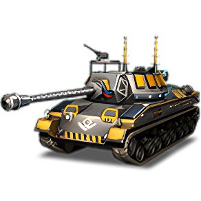 车身侧面的黑黄拼接模块,边缘裸露着锈蚀的螺栓与管线,如同临时加装的能量扩容仓,强化了 “拼凑改装” 的实感;履带的负重轮轮毂为深灰,边缘用黄色 “磨损警示条” 点缀,履带板的锈蚀纹理与装甲旧化呼应;机械组件表面的 “齿轮锈迹”“液压杆油污” 暗纹,用黄褐与深灰的层次区分,让 “粗犷机械感” 从平面涂装中立体浮现。炮塔以沙砾黄褐为底,正面 X 形防护板带断裂黄痕,像刚挨过破甲刃剐蹭;顶部双天线裹着掉漆漆的黑黄警示环,仿佛是时刻扫描战场信号的 “猎手雷达”,高射机枪架沾着油污锈斑,满是实战痕迹;炮塔前端的 “X 形防护板”,锈蚀金属灰底色嵌着黄色划痕,仿佛是近战格挡留下的战痕。