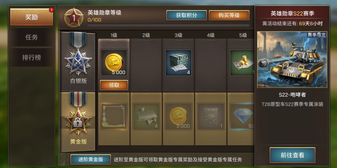 此外,荣耀勋章默认从 1 级解锁,最高可冲刺至 200 级。达到 100 级后,黄金勋章的珍稀奖励会以同等规格持续放送,每提升 1 级需要 100 积分~ 各位指挥官,速赴 S22 赛季的任务战场,攒积分、夺勋章,在装甲对决中铸就传奇吧!