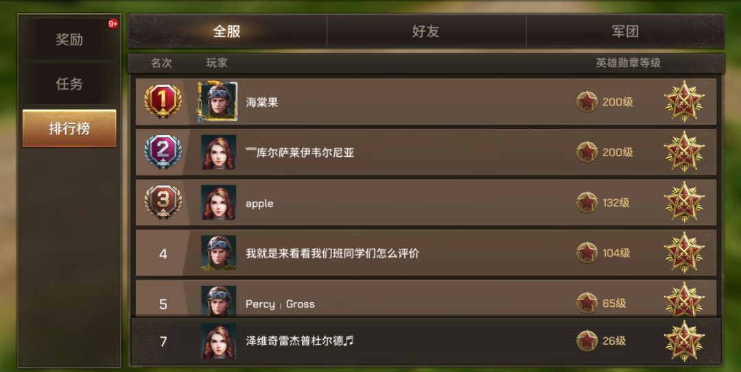 全服排行榜:集结全服最强战术大师,能在此榜稳居上游,不仅是个人操作与战略思维的双重证明,更会成为全服瞩目的传奇标杆,你的ID将随胜利号角传遍战场,成为万千指挥官追逐的信仰;好友排行榜:是与战友切磋比拼的温情赛场!看着熟悉的名字在榜单上交替攀升,既有相互激励的竞技激情,又让赛季征程充满并肩同行的暖意,每一次积分反超,都是对挚友实力的“最高认可”;军团排行榜:是检验军团战力的终极战场!全体成员的每一分努力都将转化为军团前进的动力,你完成的每一个任务、斩获的每一份积分,都是军团荣耀的基石,当军团在全服闪耀光芒时,那份刻入骨髓的集体荣光,会让你深刻体会“同心为甲,共战为锋”的磅礴力量。
