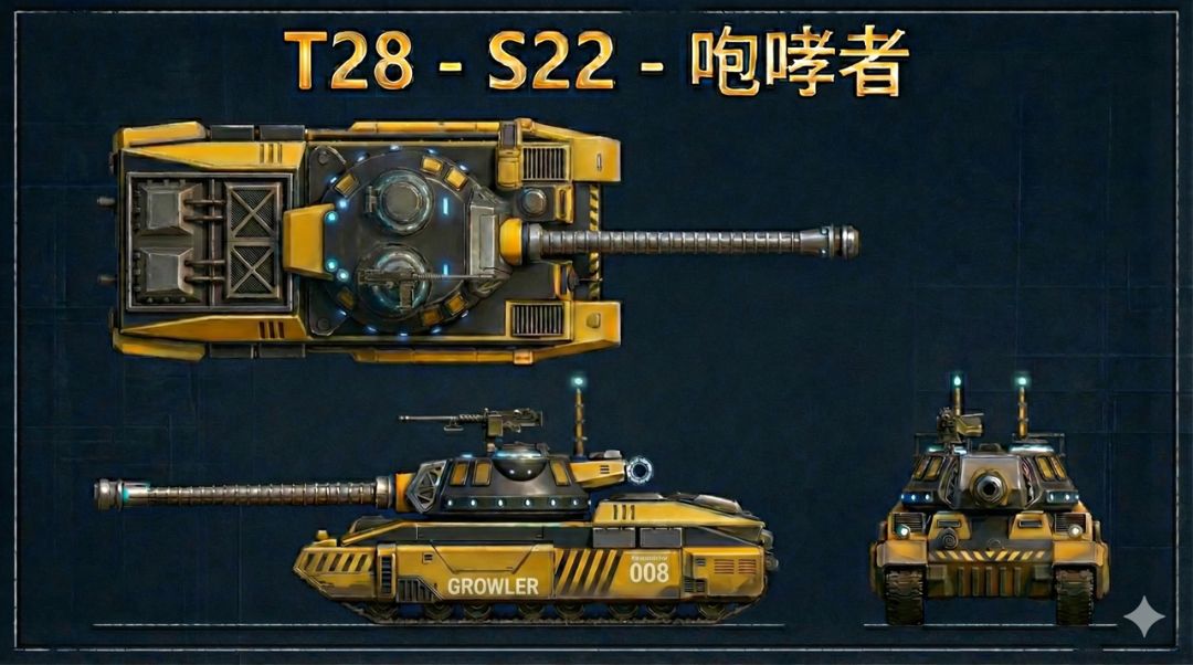 S22-咆哮者是同盟阵营Ⅳ级反坦T-28的赛季专属涂装,涂装为T-28提供三个方面的属性:隐蔽度提高5%,车身正面装甲提高6%,坦克前进最大速度提高2%,当英雄勋章等级达到100时解锁。