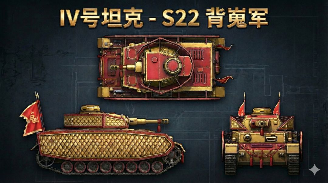 S22-背嵬军是集团阵营II级中坦Ⅳ号坦克的赛季专属涂装,涂装为Ⅳ号坦克提供三个方面的属性:隐蔽度提高5%,坦克前进最大速度提高2%、瞄准速度提高5%,当英雄勋章等级达到25时解锁。