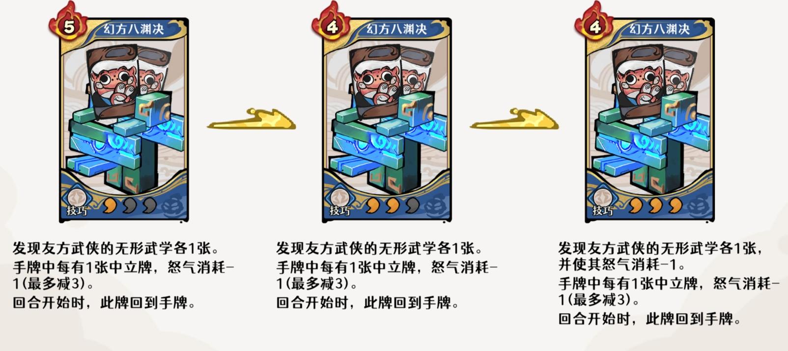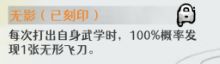 无形牌:不占用手牌上限,例如追月飞刀或者暴雨梨花等打出发现的无形飞刀,还有海渊武侠卡打出发现的两张无形武侠卡,海渊技能发现的4张无形技巧卡。目前仅有这三种情况带有无形词条。