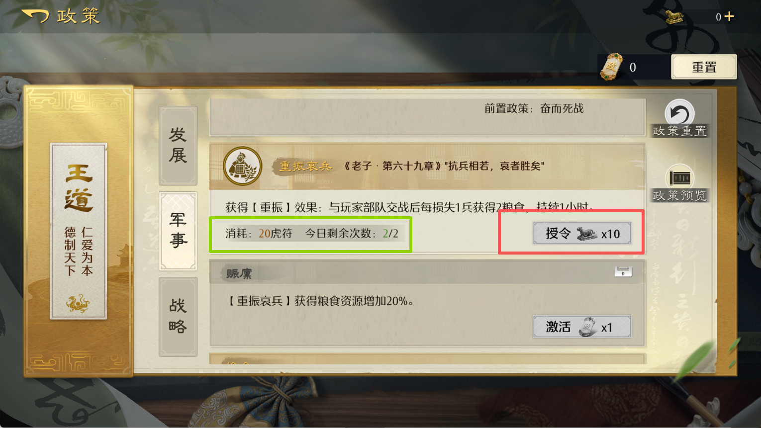 - 主动政令的使用需要消耗虎符,每日有可用次数限制和冷却时间。