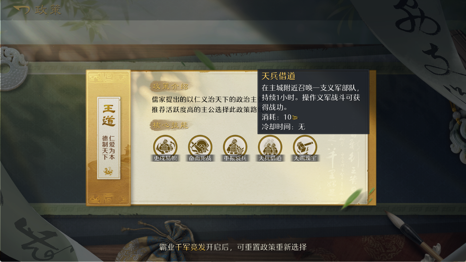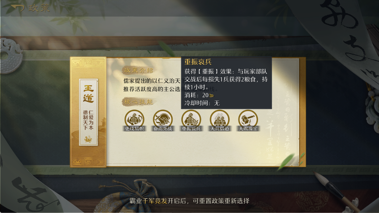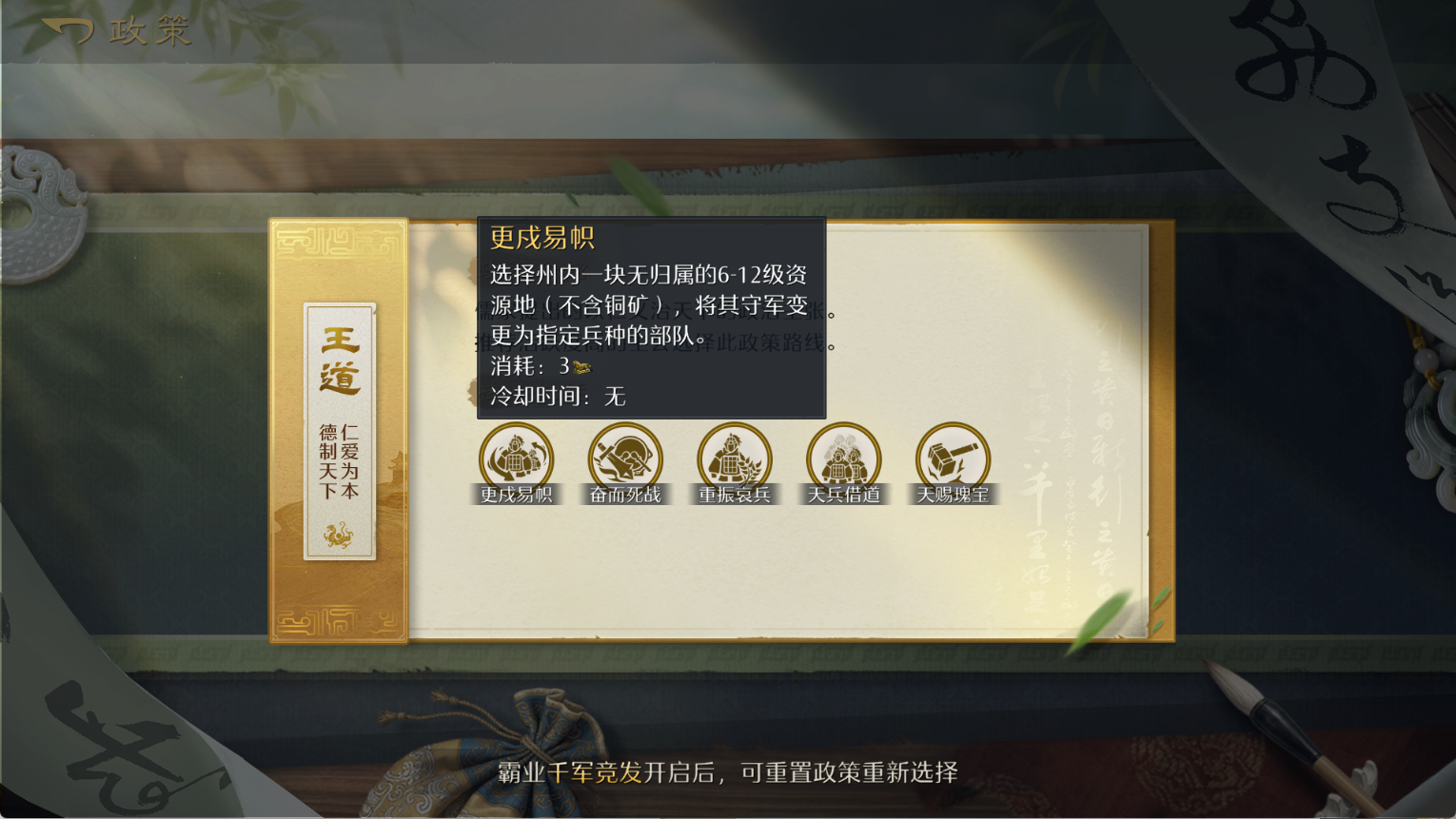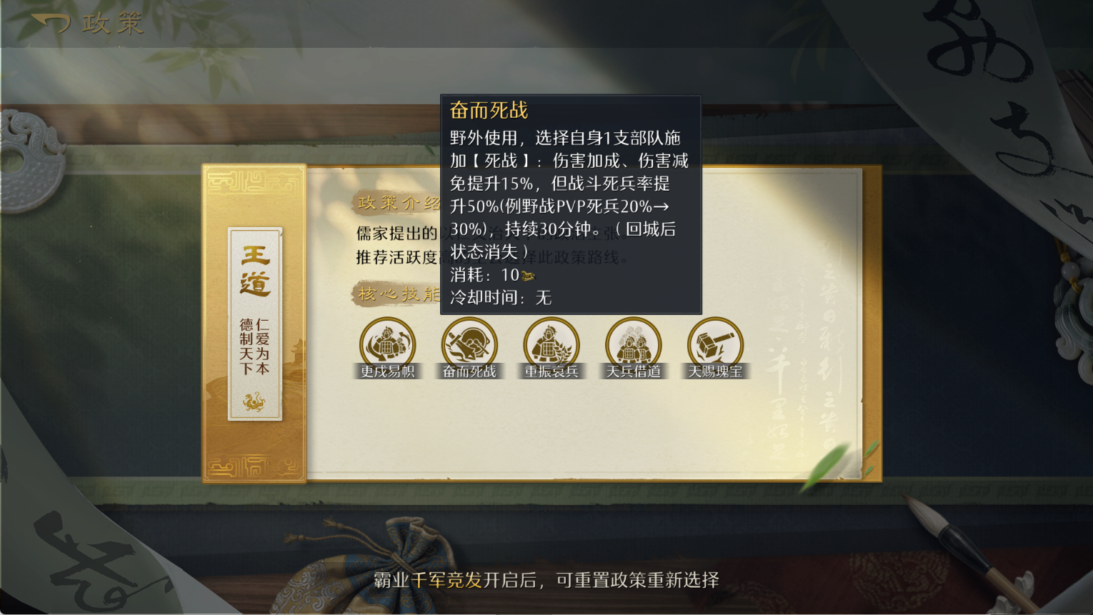 政策选择后需要等到游戏霸业进度【千军竞发】才可以进行更换(大约在开服后第13天左右)。每次重置均需48小时冷却时间,所以选择时要慎重。