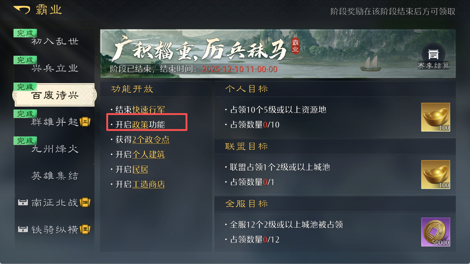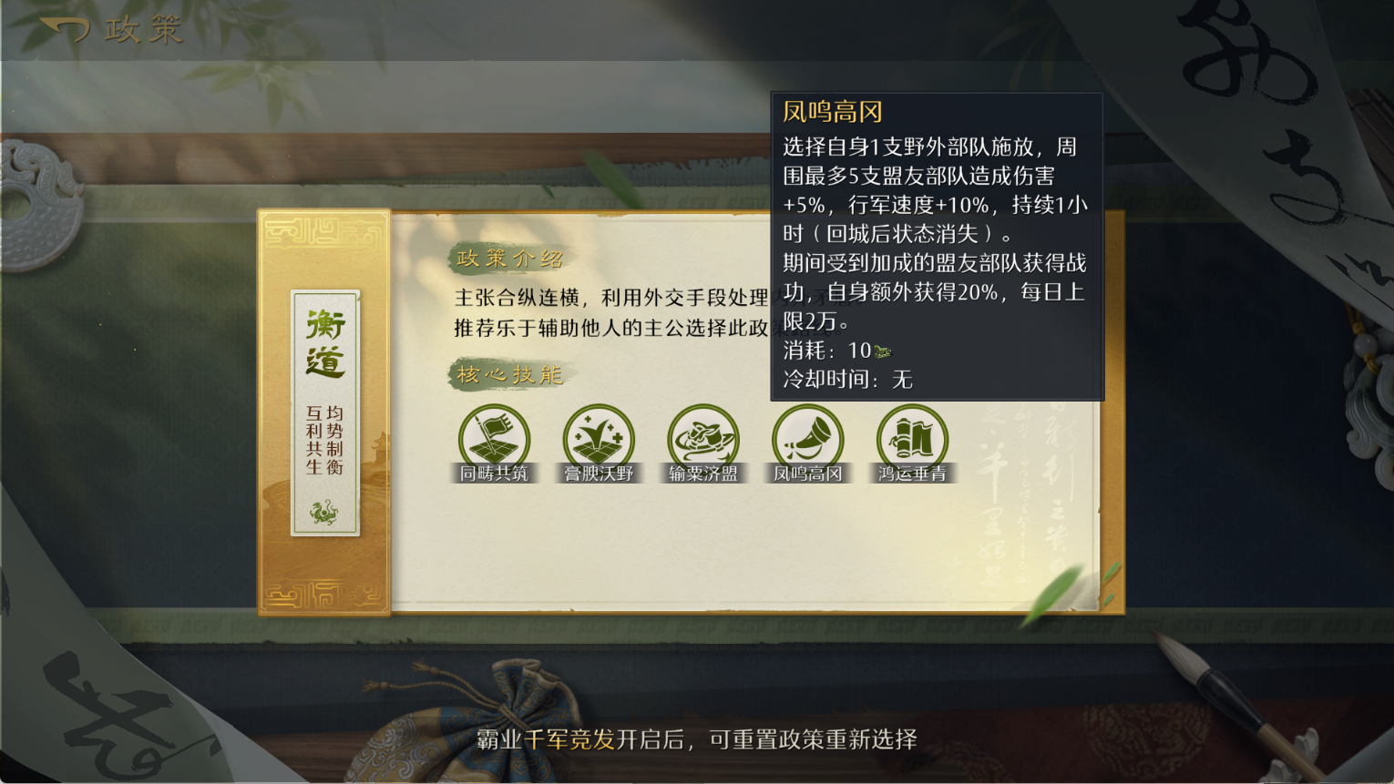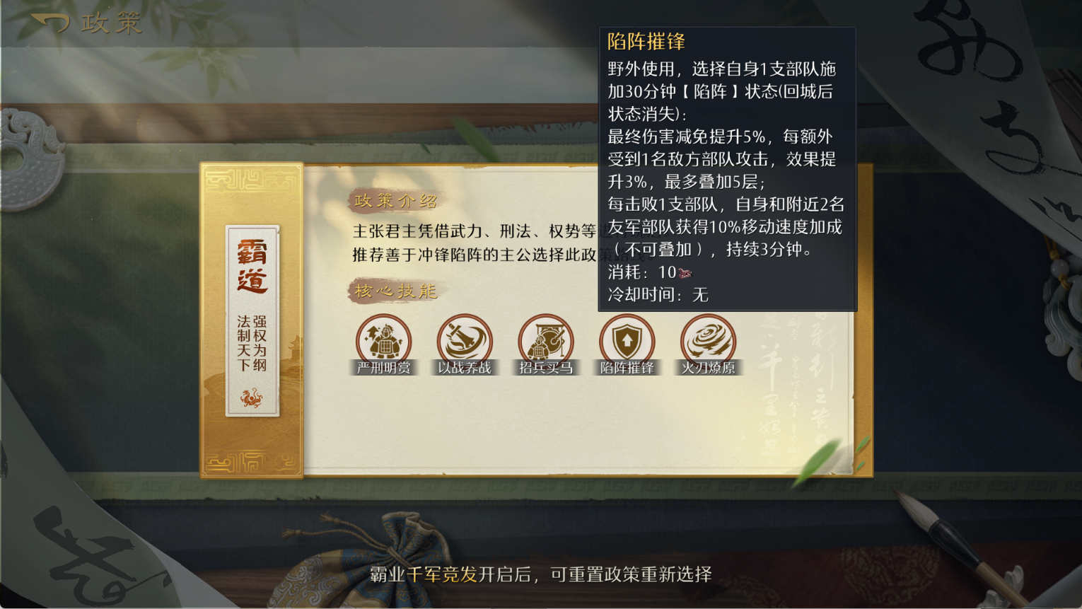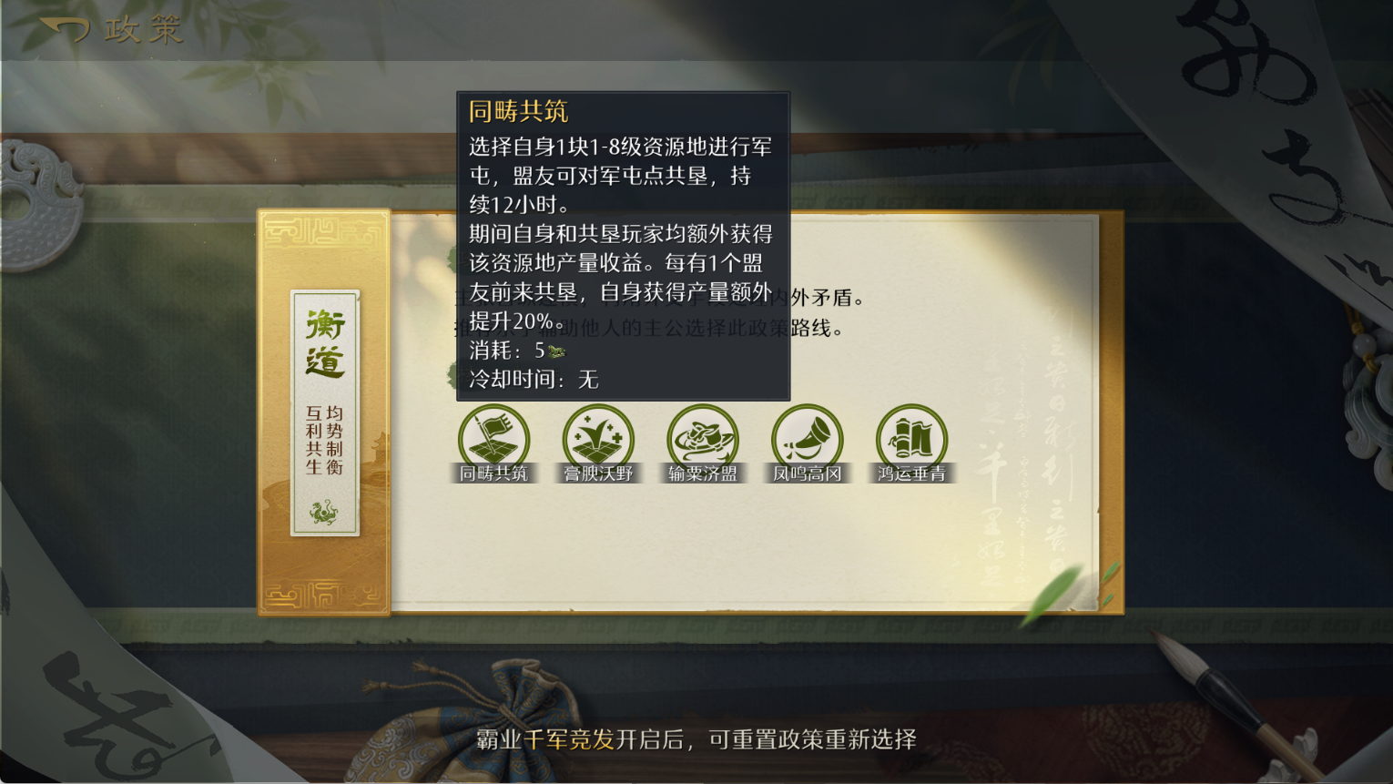 政策选择后需要等到游戏霸业进度【千军竞发】才可以进行更换(大约在开服后第13天左右)。每次重置均需48小时冷却时间,所以选择时要慎重。