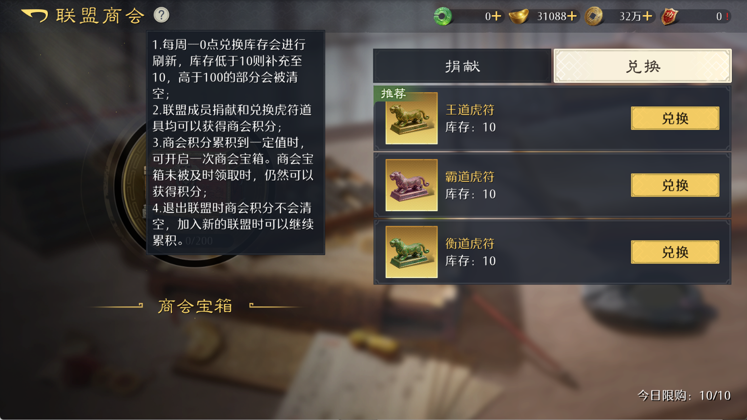 - 二是玩家可以将用不到的虎符(比如其他政策的虎符)捐献联盟商会以获取积分,积分达到一定值可以开商会宝箱。宝箱是能开金锭的,一定要记得捐献的!