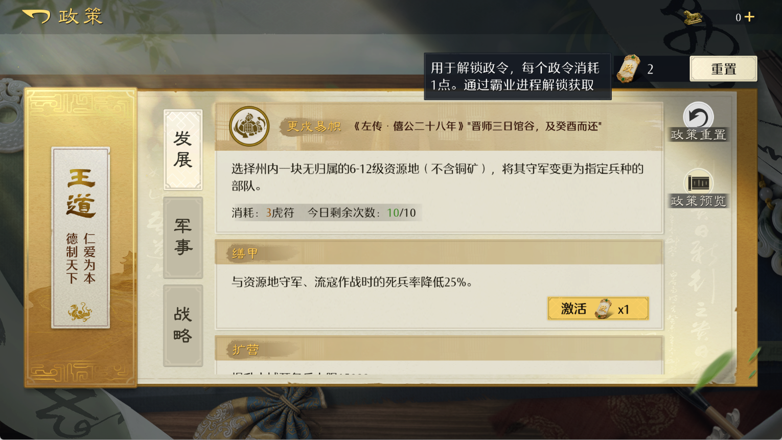 - 政令点通过霸业进度解锁,一共可以获得8个,每次学习消耗一个。一共可学习的技能有12个(4个主动,8个被动),所以我们无法解锁所有的技能,要合理分配技能选择